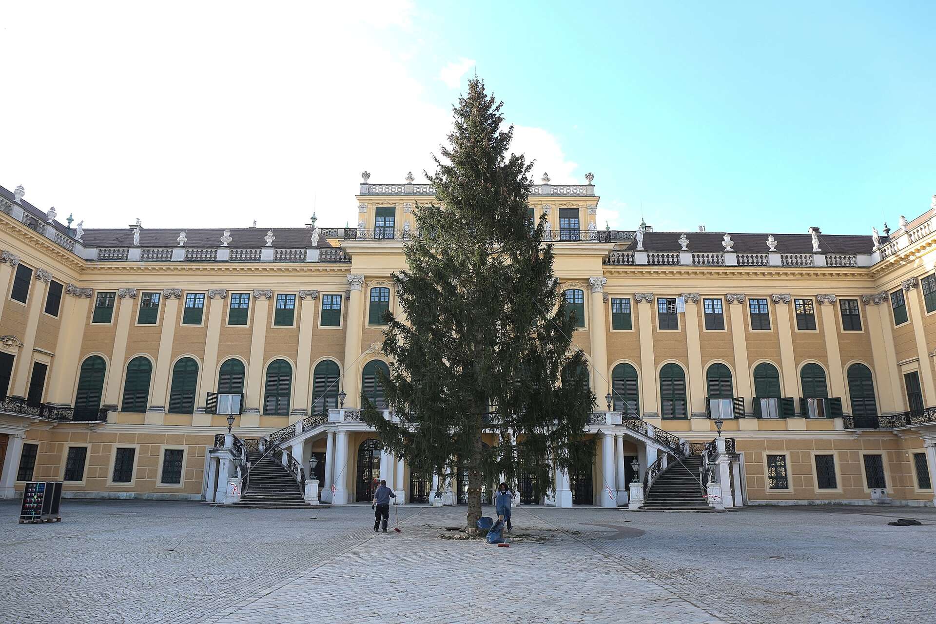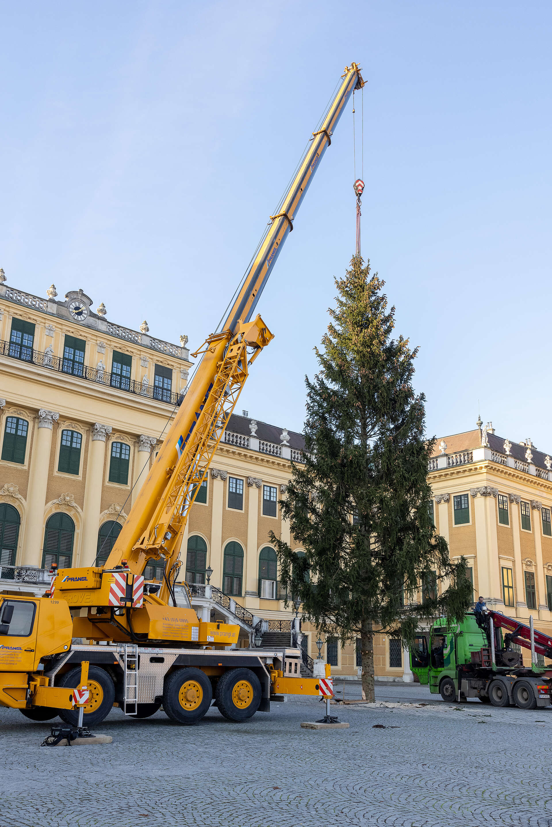 Schon Wochen zuvor haben ÖBf-Förster:innen in ihren Revieren nach dem schönsten Exemplar Ausschau gehalten. Am 31. Oktober wurde der Nadelbaum geerntet, um anschließend seine Reise nach Schönbrunn anzutreten. Nach frühmorgendlicher Ankunft in Schönbrunn am 2. November waren gegen 8 Uhr die Experten des Forstamtes der Stadt Wien am Zug: Der tonnenschwere Baum wurde per Kran vom Tieflader gehoben und fachmännisch in dem dafür vorgesehenen Schacht verankert. Zeitgleich mit seiner Ankunft startet auch der Aufbau für den Weihnachtsmarkt. Die Österreichischen Bundesforste stellen den Baum in langer Tradition zur Verfügung.