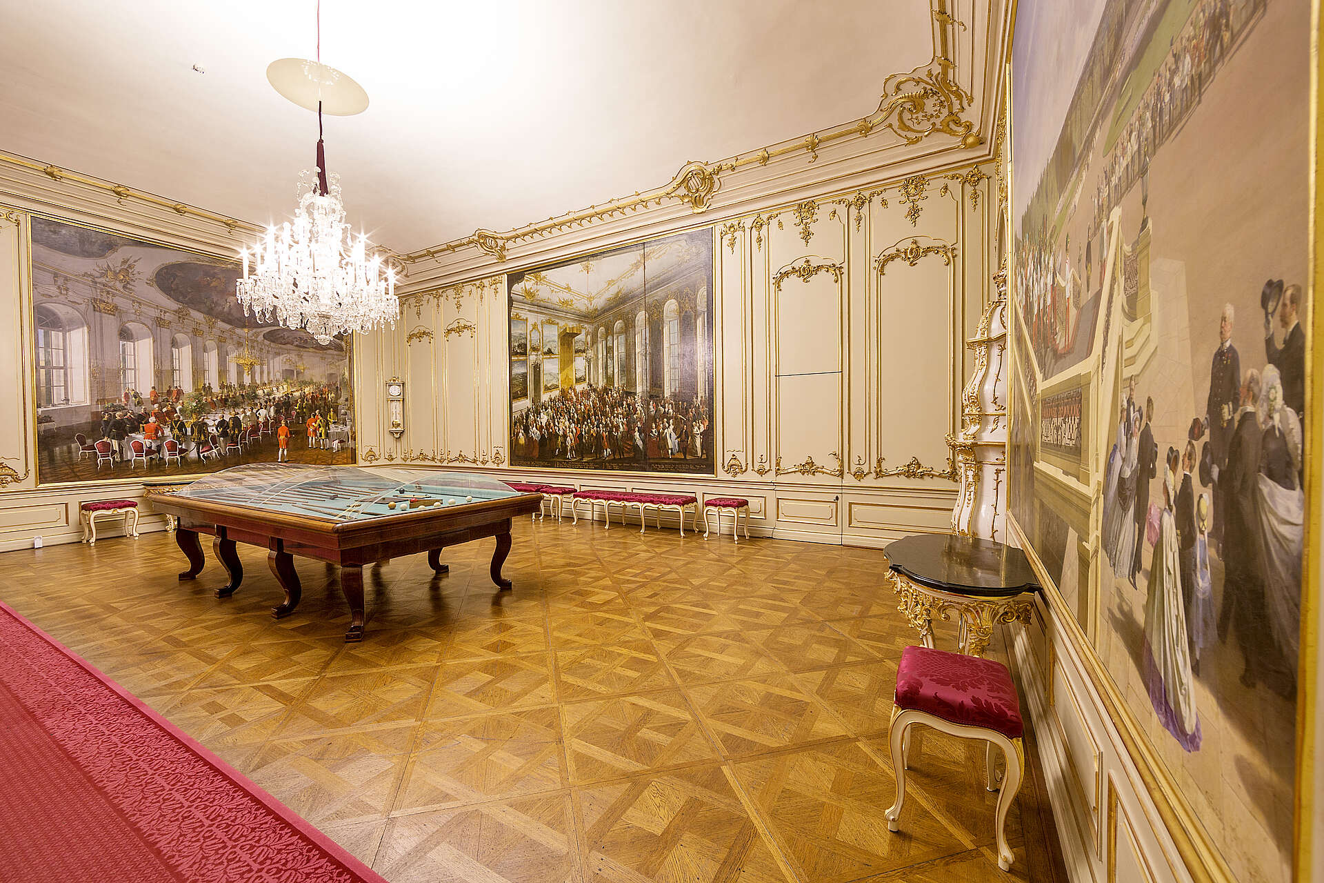 Franz Joseph verstand sich vor allem als Offizier seiner Armee. Die großformatigen Gemälde in diesem Raum haben daher den Militär-Maria-Theresien-Orden, den höchsten militärischen Verdienstorden der Habsburgermonarchie, zum Thema.