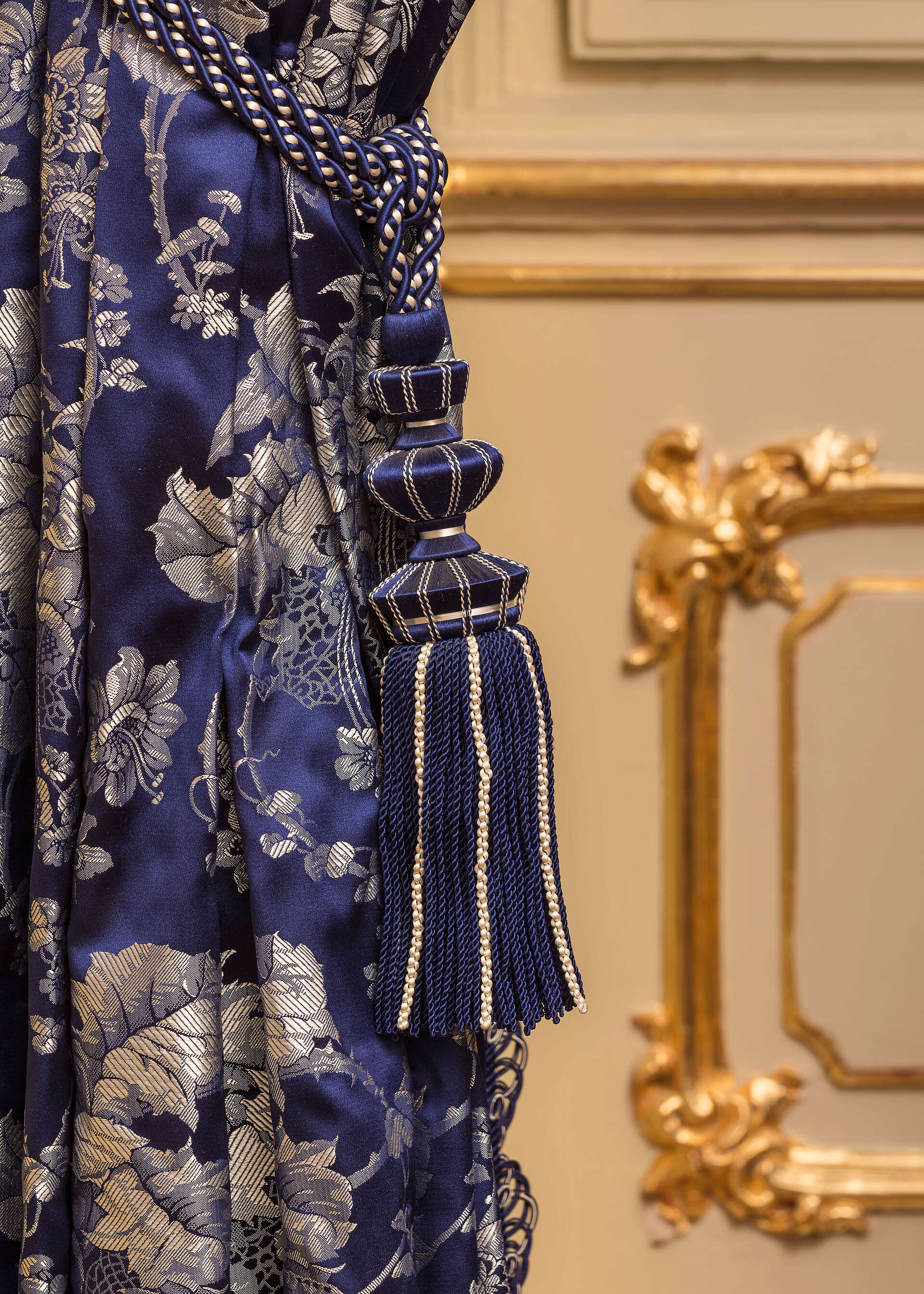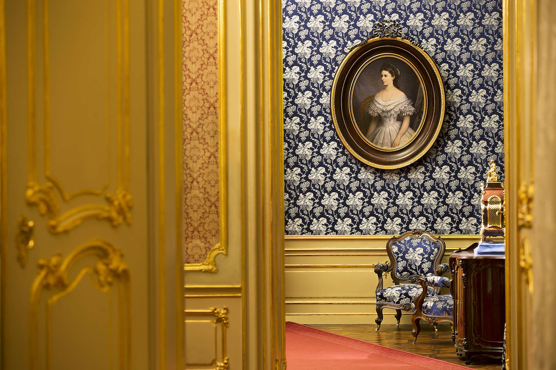 Die schweren Palisandermöbel sind in den üppigen Formen des Zweiten Rokokos gehalten, einem Stil, der die Möbelkunst der Mitte des 19. Jahrhunderts dominierte. Die Sitzmöbel wie auch die Wandfelder sind mit einem tiefblauen Seidendamast mit eingewebten weißen Blütengirlanden bespannt. Anlässlich der Raumrestaurierung im Jahr 2014 wurde die textile Ausstattung dieses Raumes nach historischen Vorlagen rekonstruiert, sodass der Raumeindruck heute wieder dem Zustand zur Zeit der Bewohnung durch das Kaiserpaar entspricht.
