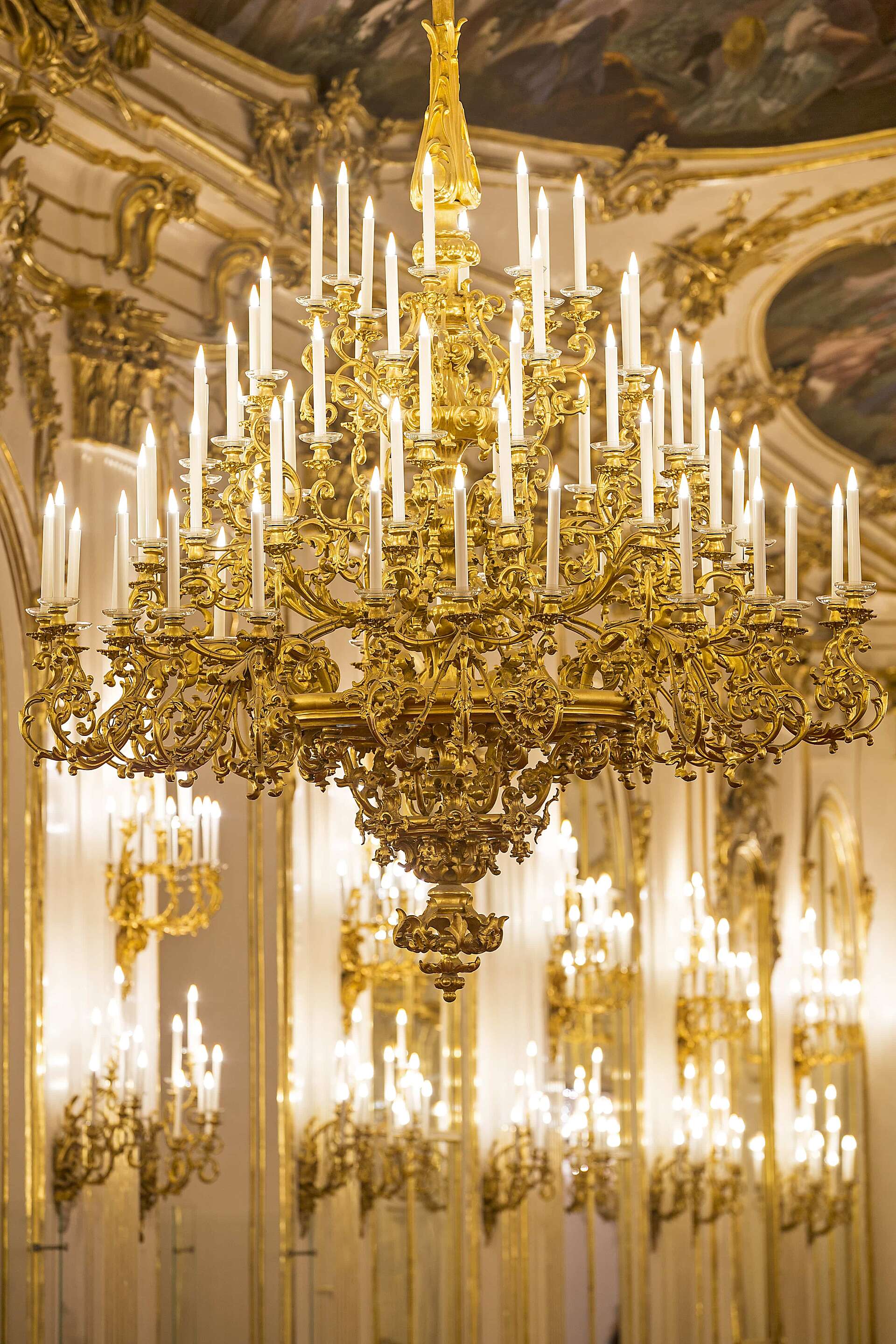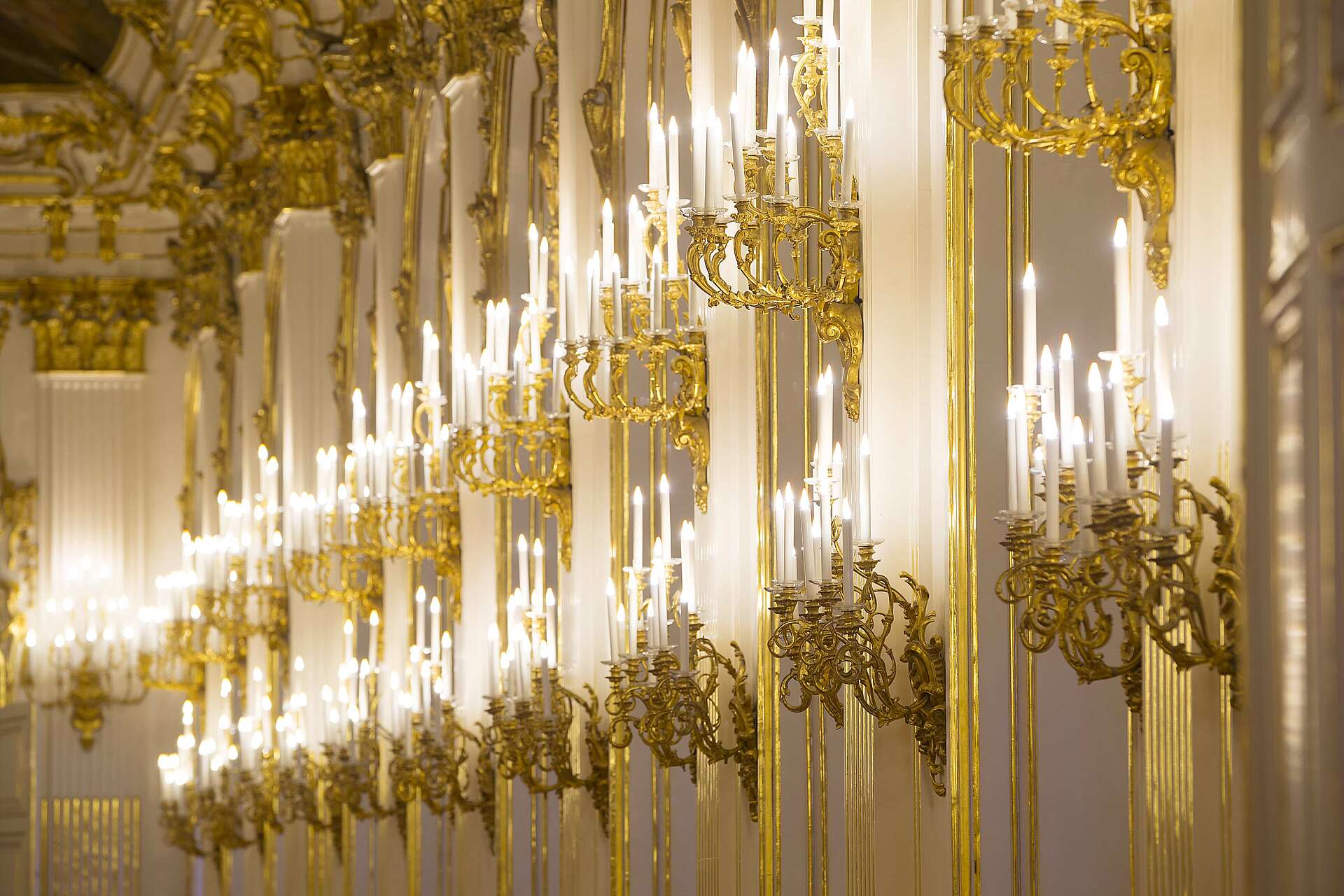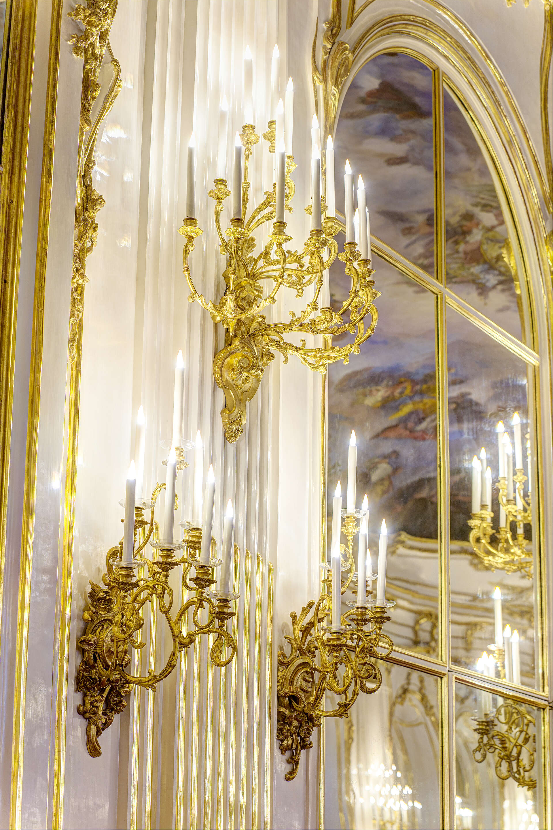 Das Licht, das durch die hohen Fenster in den Raum fällt, wird von den gegenüber angebrachten Spiegelflächen effektvoll verdoppelt. Gemeinsam mit den Deckenlustern und Wandarmen, deren Kerzenschein von den polierten Wandoberflächen reflektiert wird, sorgen sie dafür, dass dieser prächtige Saal in Licht gebadet ist. Ein wichtiges Gestaltungselement sind die beiden großen holzgeschnitzten und vergoldeten Luster, die ursprünglich jeweils mit 72 Kerzen bestückt waren. Die Installation von elektrischem Licht erfolgte im Jahre 1898, wobei entlang der Wände auch die obere Reihe der Wandarme hinzugefügt wurde.  Die Große Galerie war daher mit insgesamt 868 Glühbirnen beleuchtet. Im Rahmen der letzten umfassenden Generalsanierung der Großen Galerie 2011/2012 wurde ein innovatives Beleuchtungssystem, das mit einer zeitgemäßen Lichtlösung dem Eindruck von Kerzenlicht möglichst nahekommt, installiert: Es kommen kerzenförmige LED-Leuchten zum Einsatz, die mit ihren integrierten Kristallen flackerndes Kerzenlicht imitieren.