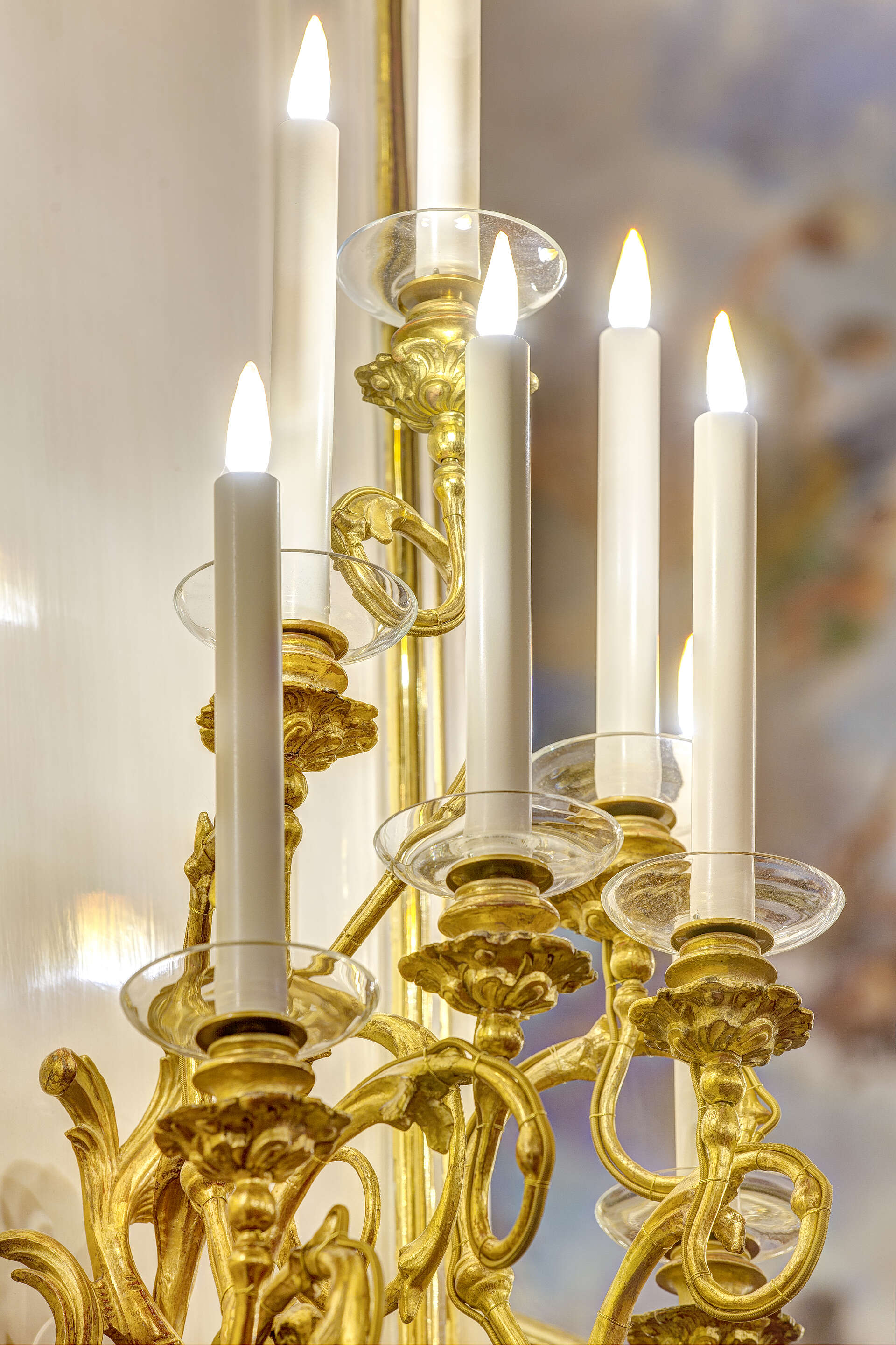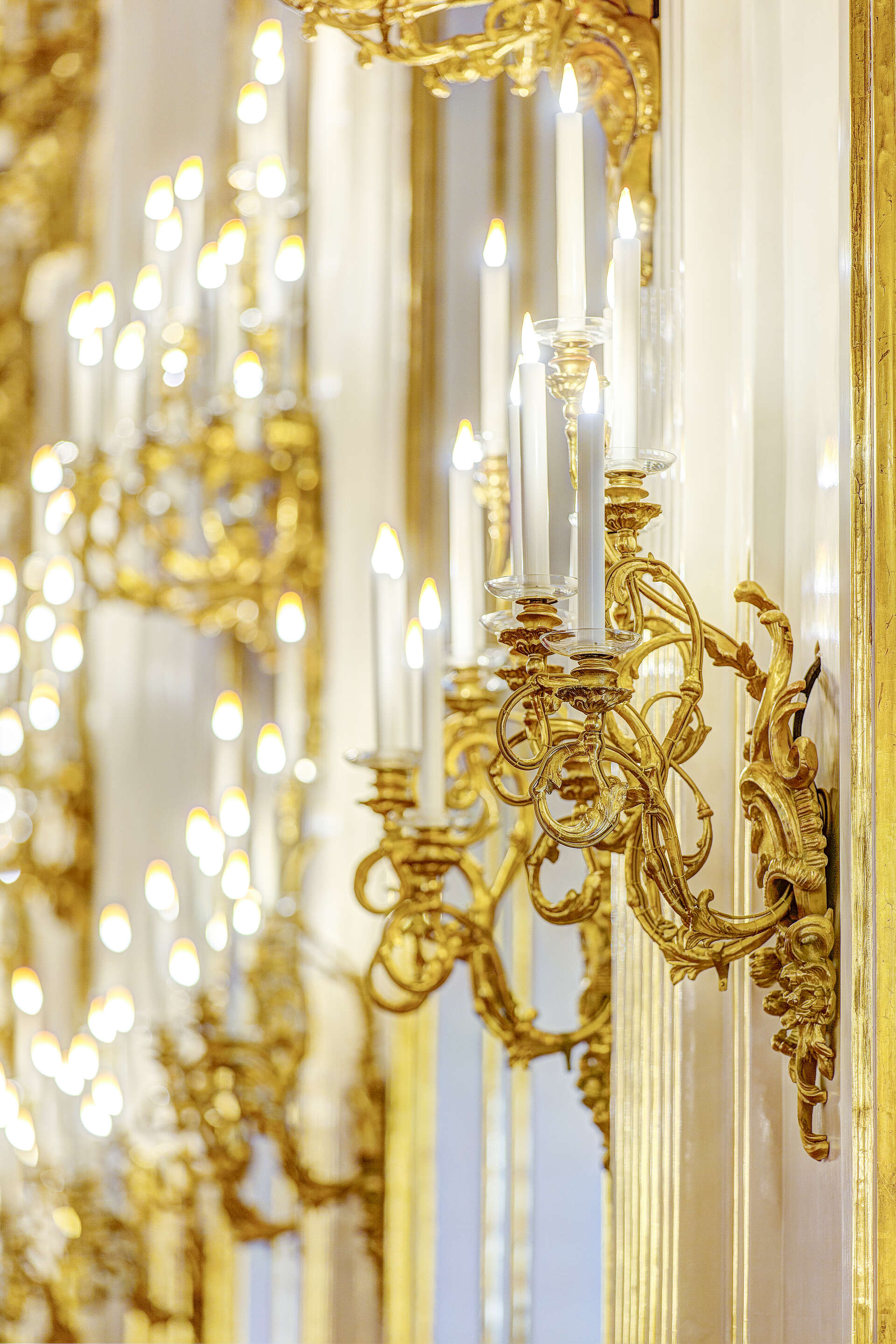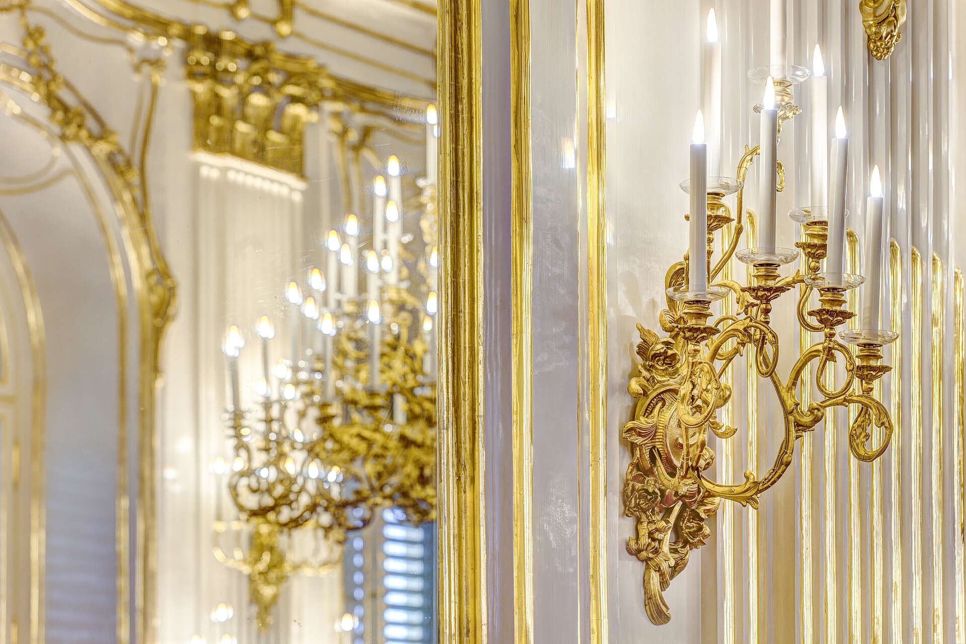 Das Licht, das durch die hohen Fenster in den Raum fällt, wird von den gegenüber angebrachten Spiegelflächen effektvoll verdoppelt. Gemeinsam mit den Deckenlustern und Wandarmen, deren Kerzenschein von den polierten Wandoberflächen reflektiert wird, sorgen sie dafür, dass dieser prächtige Saal in Licht gebadet ist. Ein wichtiges Gestaltungselement sind die beiden großen holzgeschnitzten und vergoldeten Luster, die ursprünglich jeweils mit 72 Kerzen bestückt waren. Die Installation von elektrischem Licht erfolgte im Jahre 1898, wobei entlang der Wände auch die obere Reihe der Wandarme hinzugefügt wurde.  Die Große Galerie war daher mit insgesamt 868 Glühbirnen beleuchtet. Im Rahmen der letzten umfassenden Generalsanierung der Großen Galerie 2011/2012 wurde ein innovatives Beleuchtungssystem, das mit einer zeitgemäßen Lichtlösung dem Eindruck von Kerzenlicht möglichst nahekommt, installiert: Es kommen kerzenförmige LED-Leuchten zum Einsatz, die mit ihren integrierten Kristallen flackerndes Kerzenlicht imitieren.