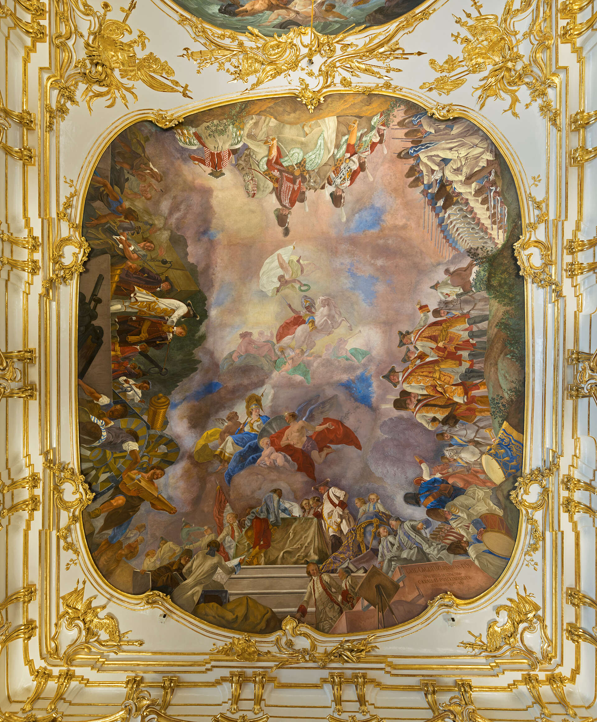 Das östliche Deckenfresko ist eine Allegorie auf die militärische Stärke der Armeen Maria Theresias. Im Zentrum der Darstellung sprengt der Kriegsgott Mars auf einem weißen Pferd über den Himmel, ein Genius empfiehlt Minerva, der Göttin der Kriegskunst, eine Gruppe von hohen Offizieren auf dem Feldherrnhügel. Gleichzeitig thront sie als Schirmherrin über einer eindrucksvoll geschilderten Unterrichtsstunde in der mariatheresianischen Militärakademie, die 1752 von Maria Theresia in Wiener Neustadt gegründet worden war.