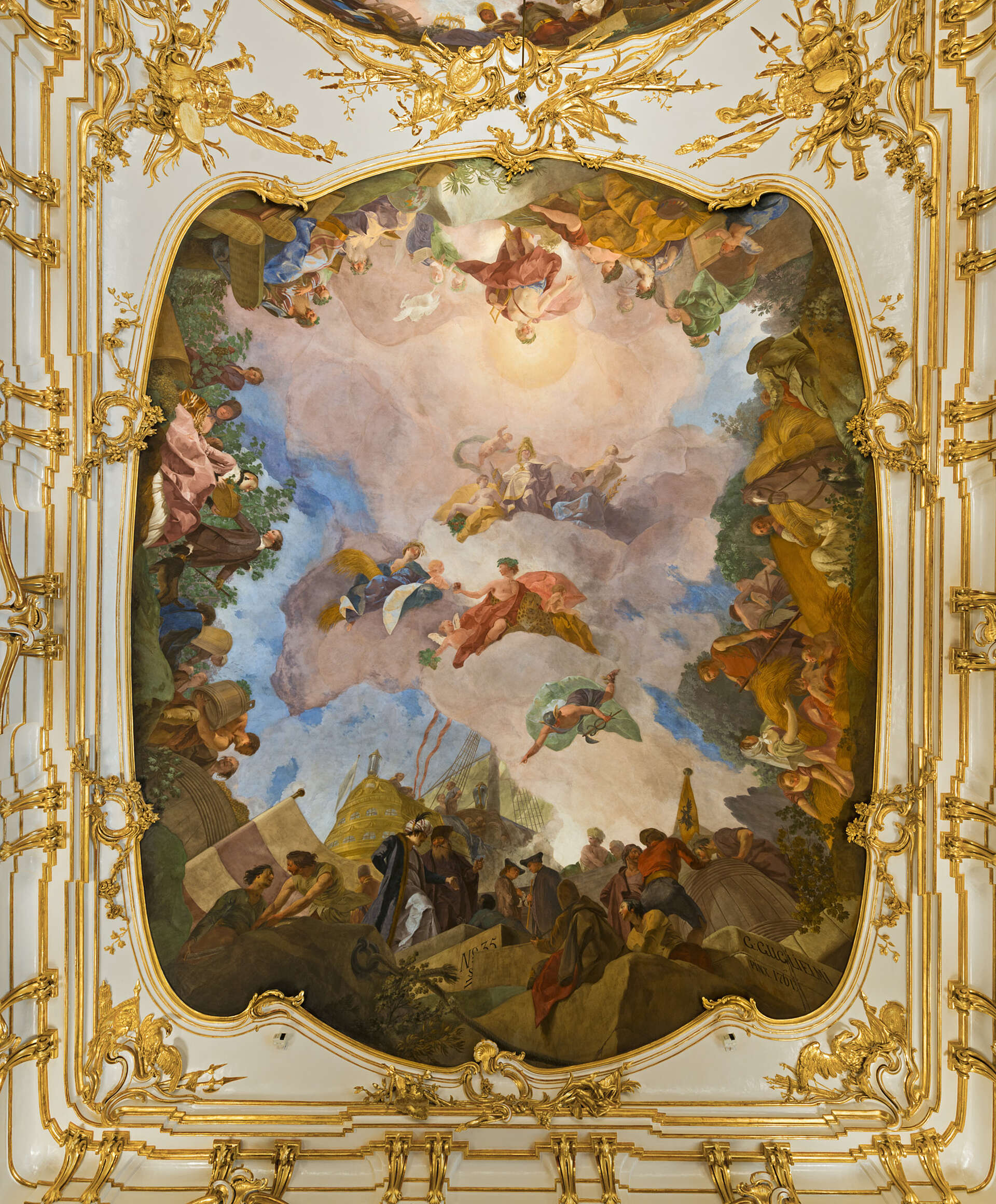 Die Deckenfresken stammen vom italienischen Maler Gregorio Guglielmi und folgen einem aussagekräftigen Programm:
