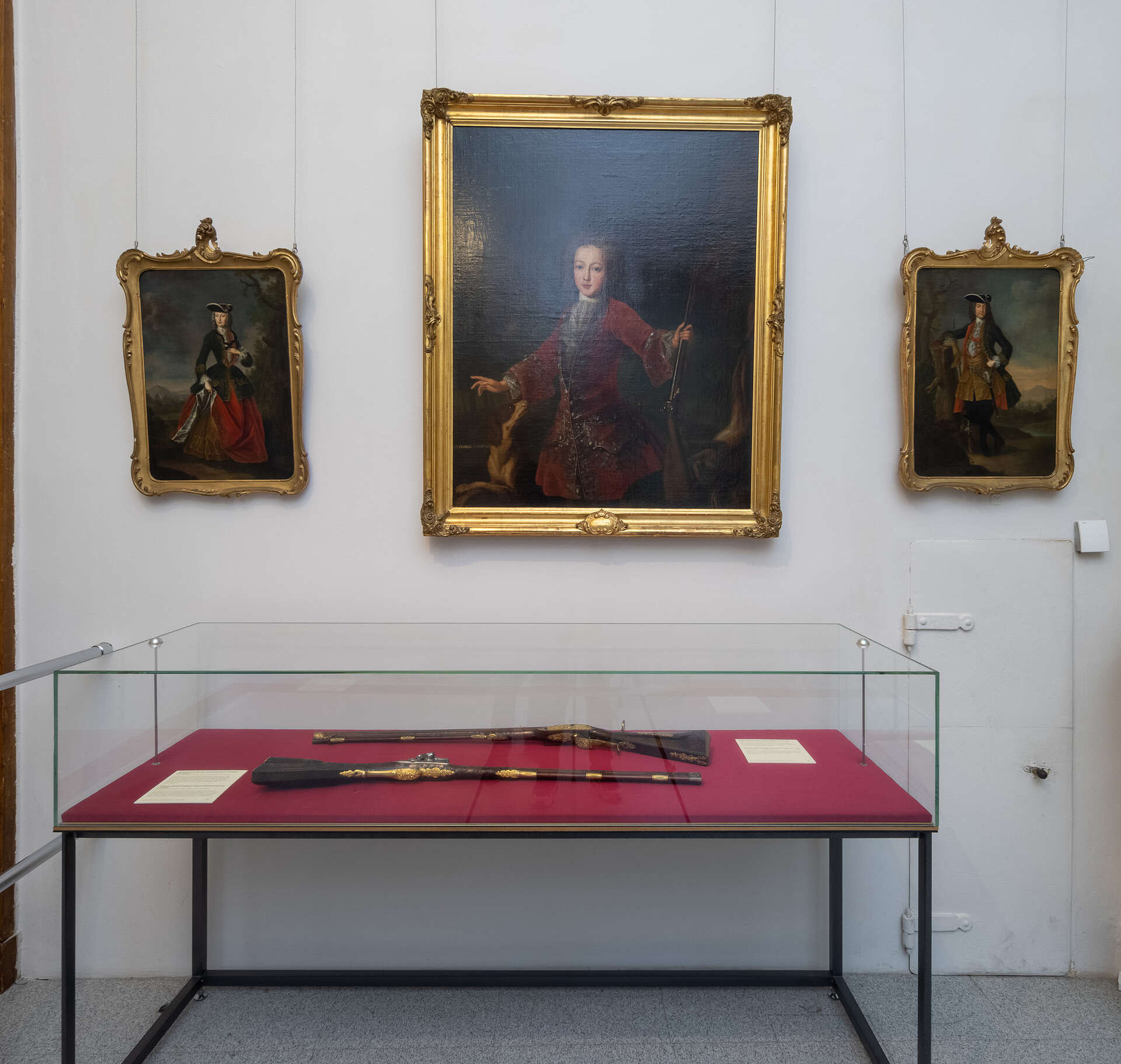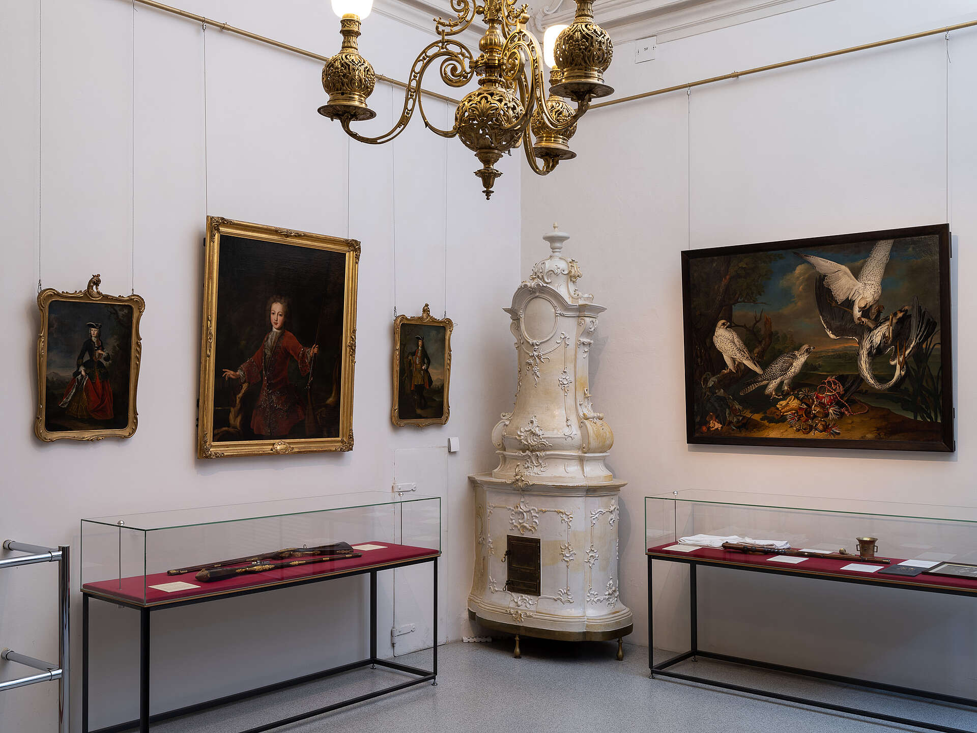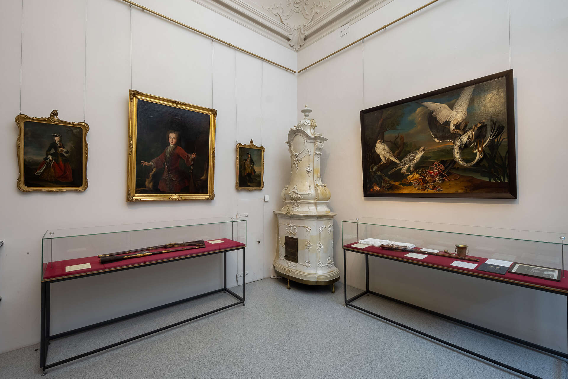 Weitere Gemälde und Vitrinenexponate sind dem Thema Jagd gewidmet. Viele Mitglieder der Dynastie waren leidenschaftliche Jäger. Unter den Gemälden, die Angehörige der Familie Maria Theresias im Jagdgewand zeigen, sind Franz Stephan, der spätere Gemahl Maria Theresias, im Knabenalter oder die Eltern der Kaiserin, Kaiser Karl VI. und Kaiserin Elisabeth Christine, hervorzuheben. Gerade unter Kaiser Karl VI. erlebte die Jagdkultur am Wiener Hof einen Höhepunkt.