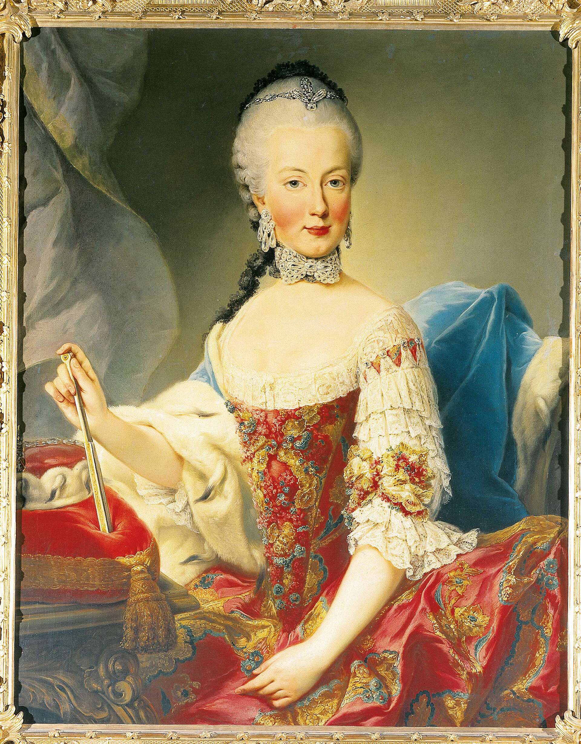 Maria Theresia, deren Porträt in der Mitte des Raumes auf einer Staffelei aufgestellt ist, war die Ur-Urgroßmutter von Kaiser Franz Joseph und regierte von 1740 bis 1780. Sie war Mutter von sechzehn Kindern – sie schenkte elf Töchtern und fünf Söhnen das Leben.