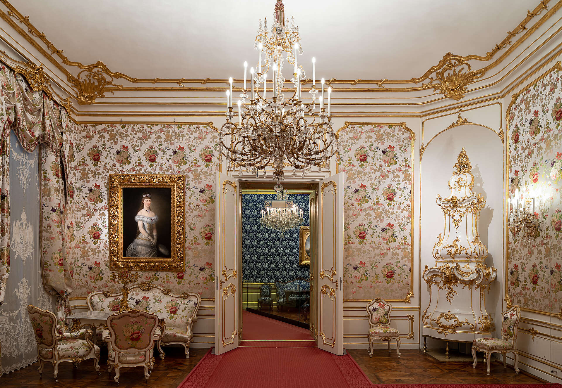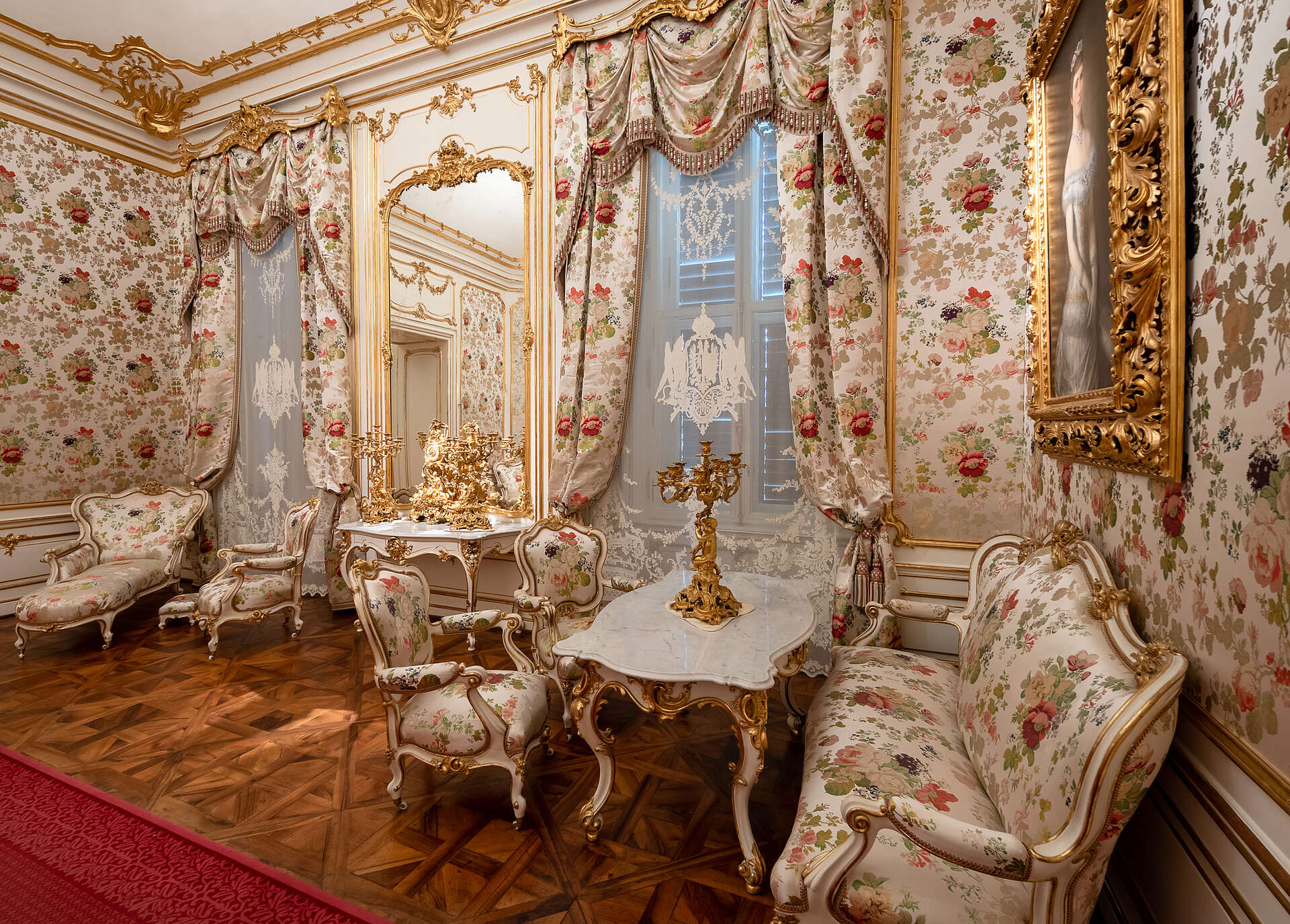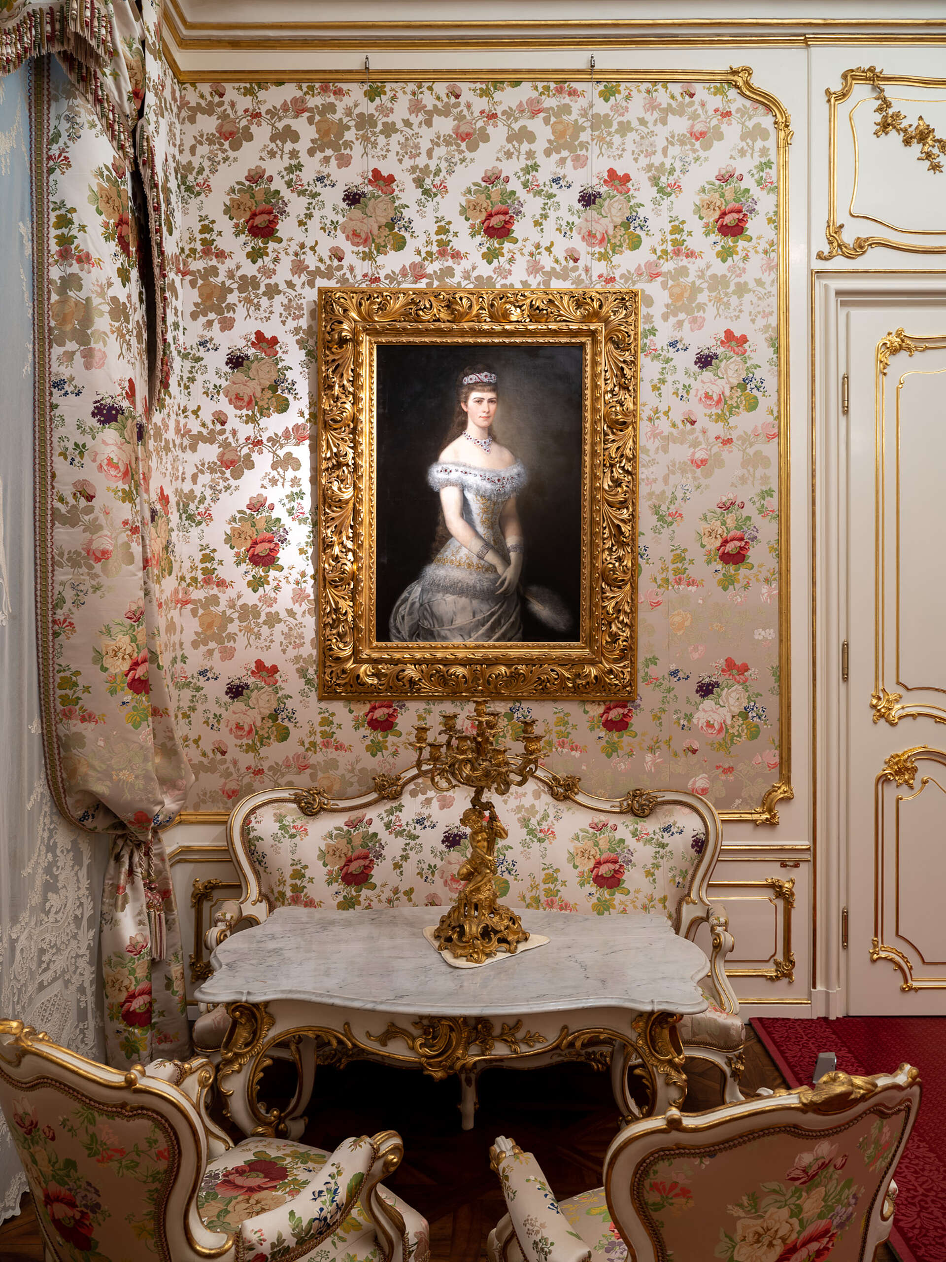 Dieser Raum diente Elisabeth als Empfangszimmer. Die Einrichtung im Stil des Zweiten Rokokos ist ein typisches Beispiel für die Ausstattung eines Repräsentationsraumes des Wiener Hofes zur Zeit Kaiser Franz Josephs.