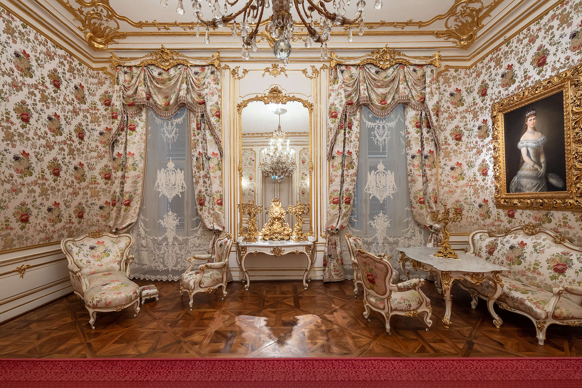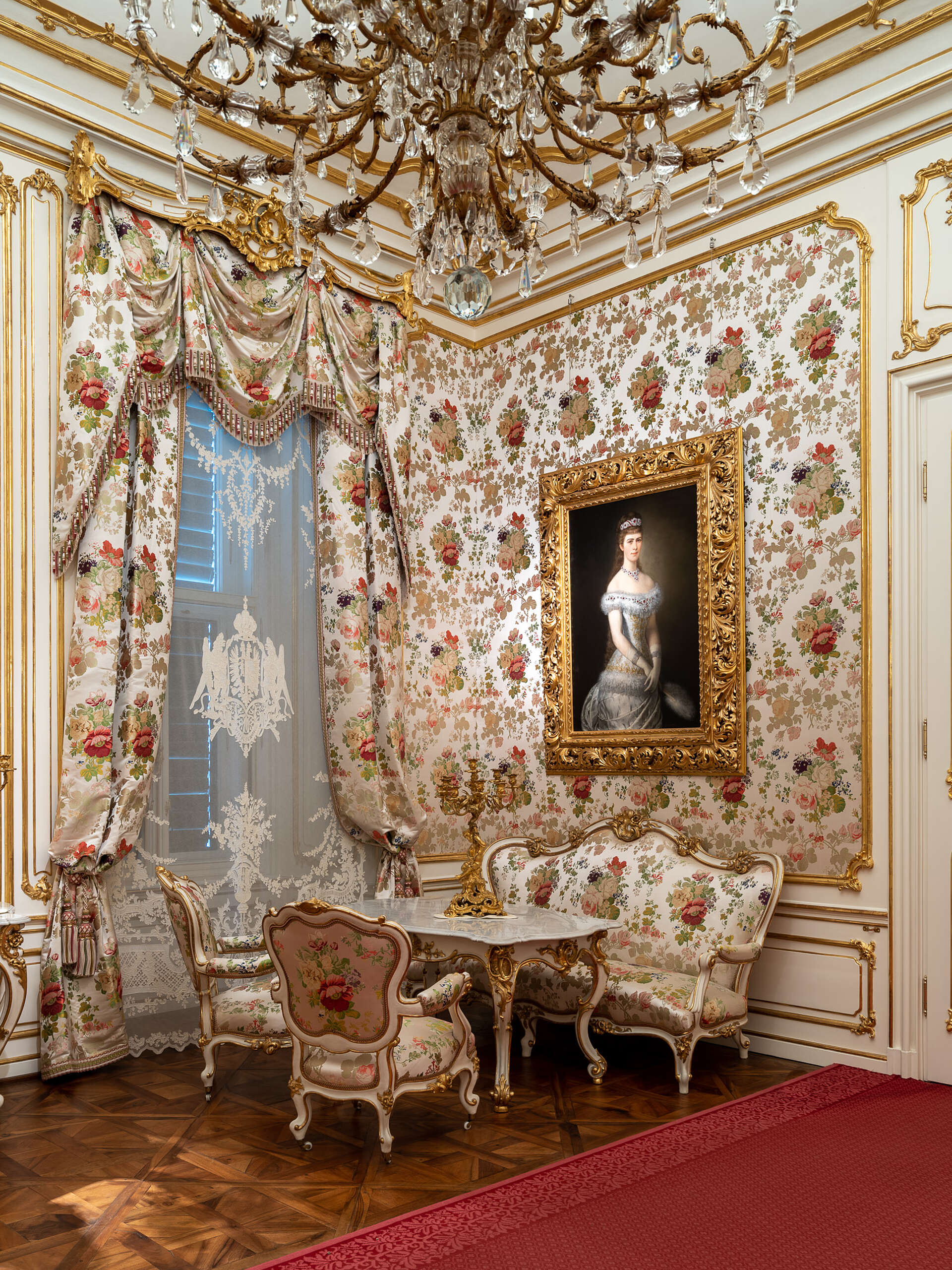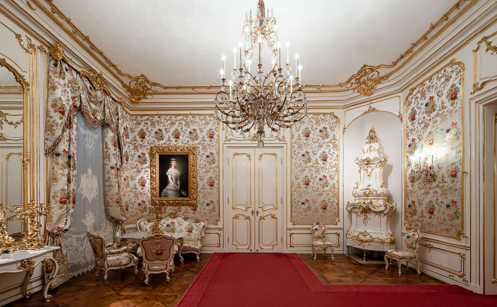 Dieser Raum diente Elisabeth als Empfangszimmer. Die Einrichtung im Stil des Zweiten Rokokos ist ein typisches Beispiel für die Ausstattung eines Repräsentationsraumes des Wiener Hofes zur Zeit Kaiser Franz Josephs.