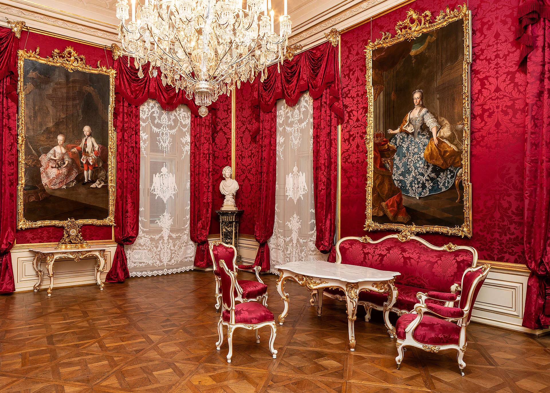 Durch eine Glastür können Sie in den Ecksalon sehen, der mit lebensgroßen Porträts von Kindern Maria Theresias geschmückt ist.