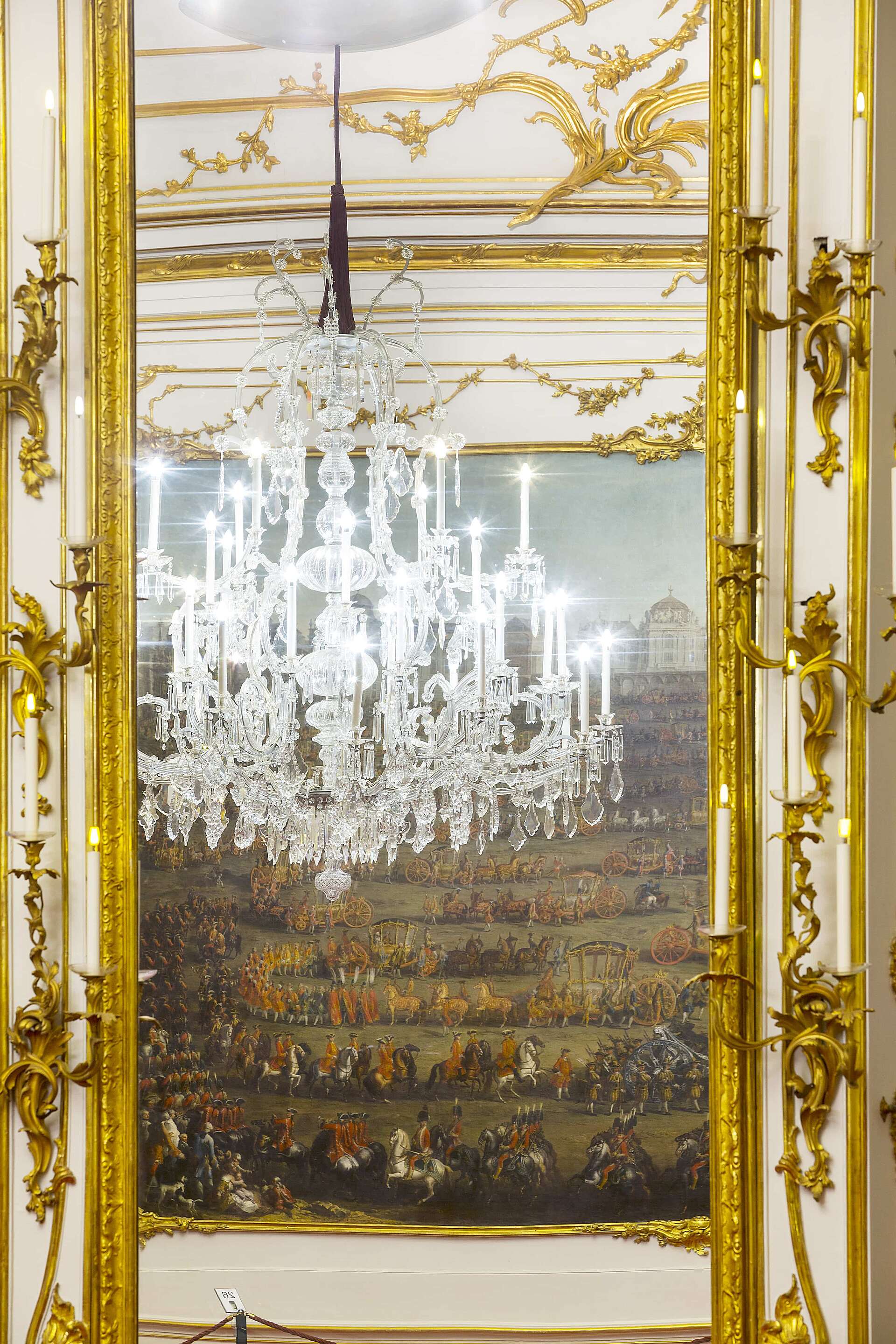 Der Zeremoniensaal zeichnet sich durch die monumentalen Gemälde aus, die ein bedeutendes politisch-gesellschaftliches wie auch familiäres Ereignis darstellen, nämlich die Vermählung des Thronfolgers Joseph im Jahre 1760.