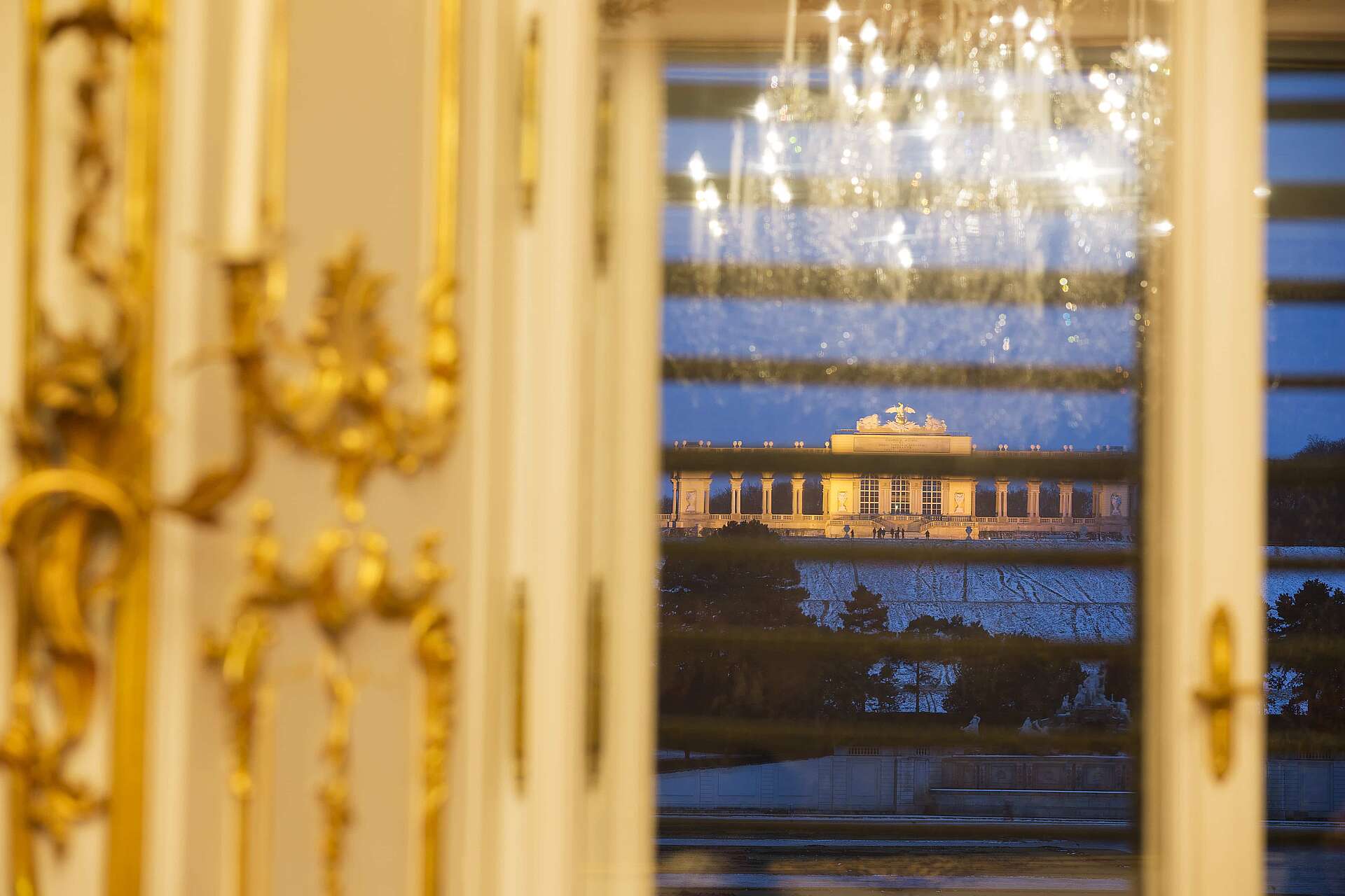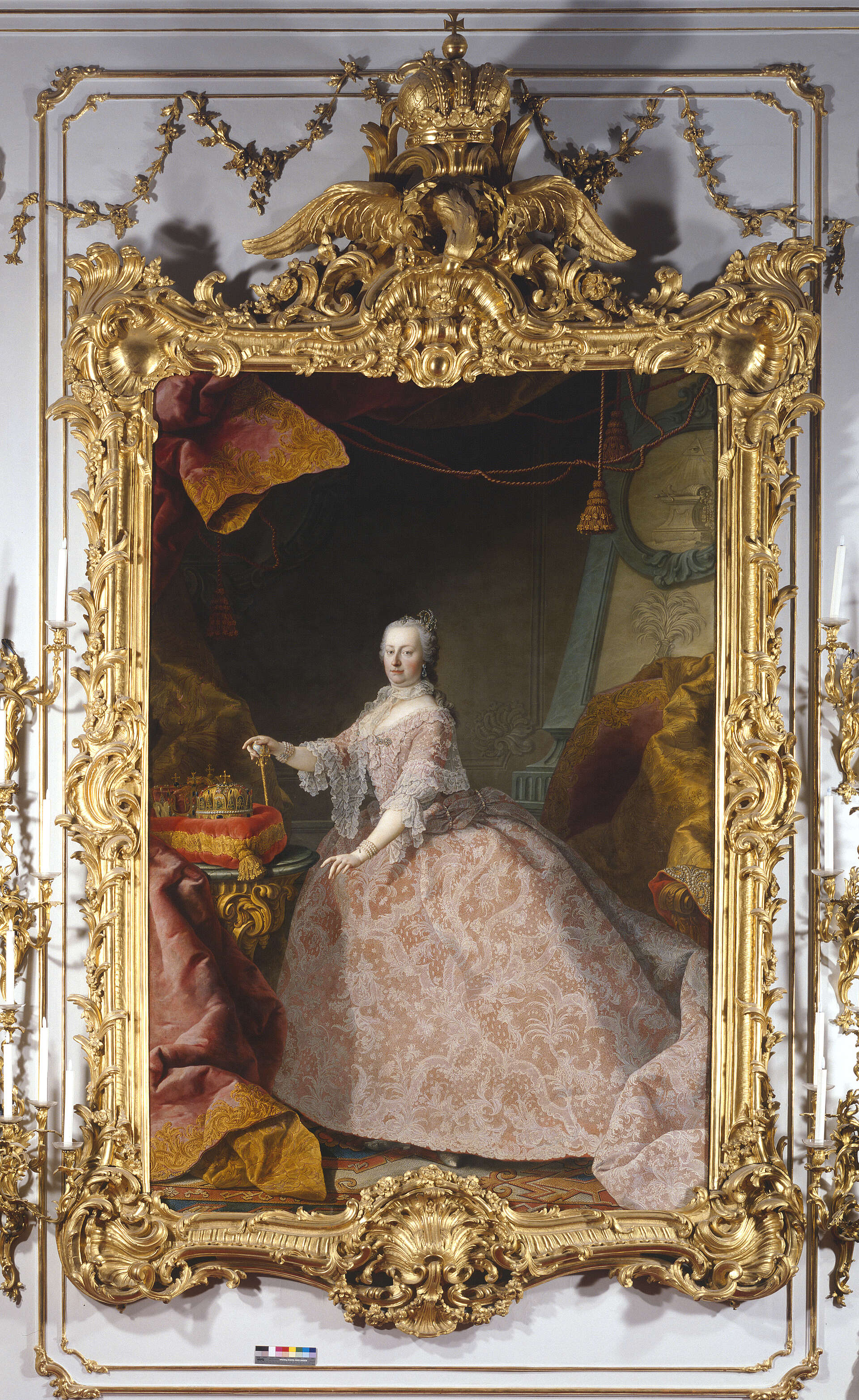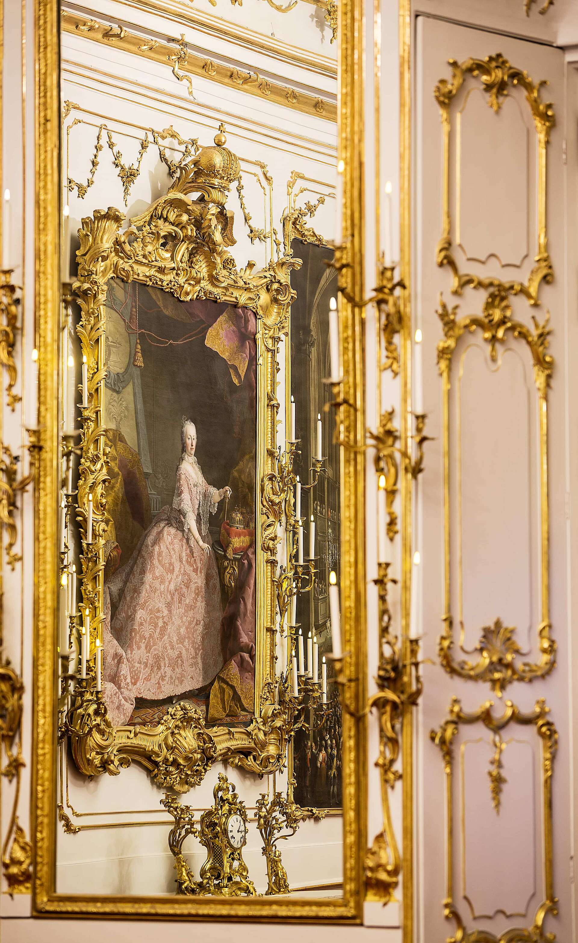 Der Zeremoniensaal diente am Hof Maria Theresias als Zweite oder Große Antecamera. Die Monarchin empfing hier unter einem Thronbaldachin ihre Gäste zur Audienz. Heute hängt an dieser Stelle das wohl bekannteste Porträt Maria Theresias, das sie als „erste Dame Europas“ in einem kostbaren Kleid aus Brabanter Spitze zeigt.