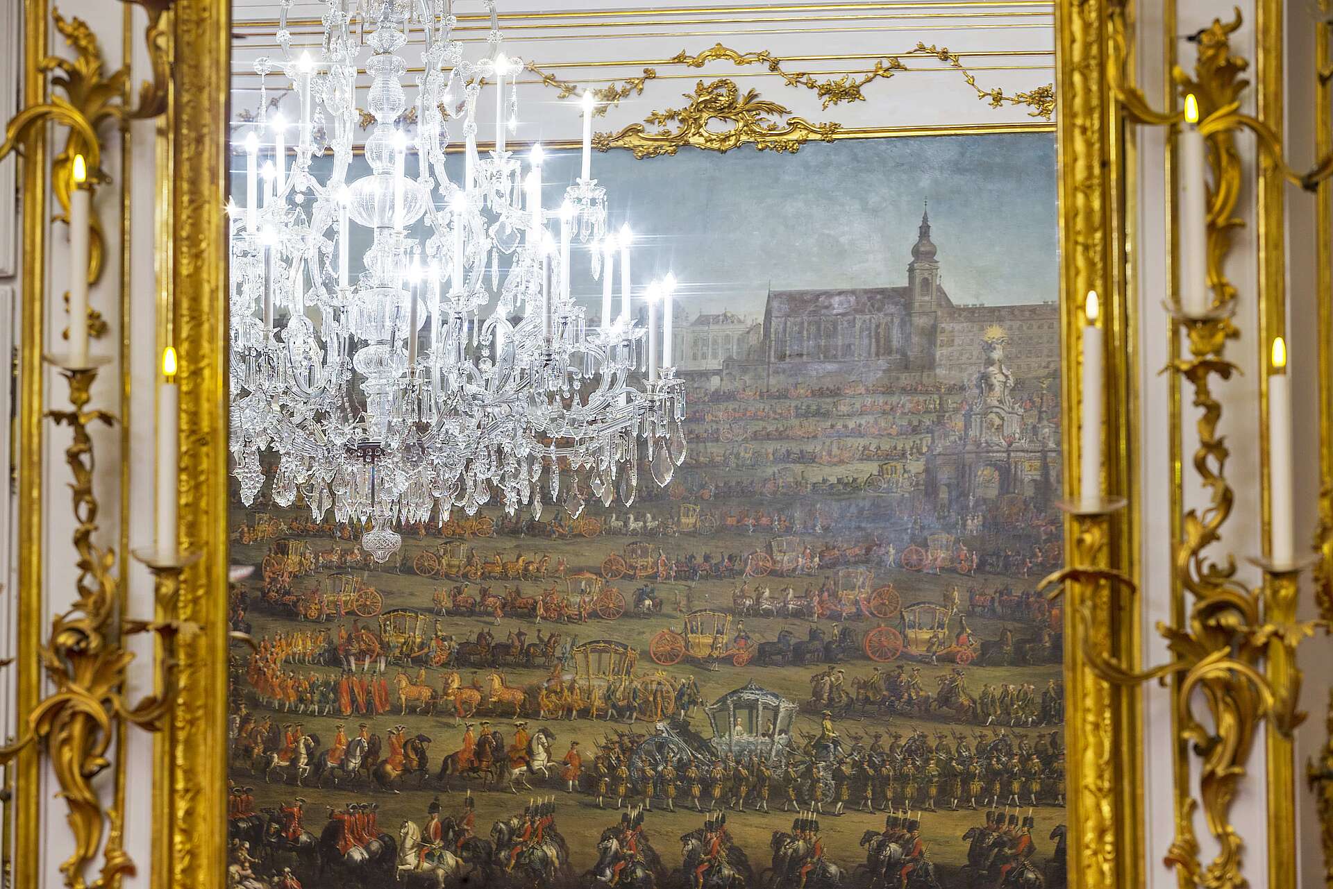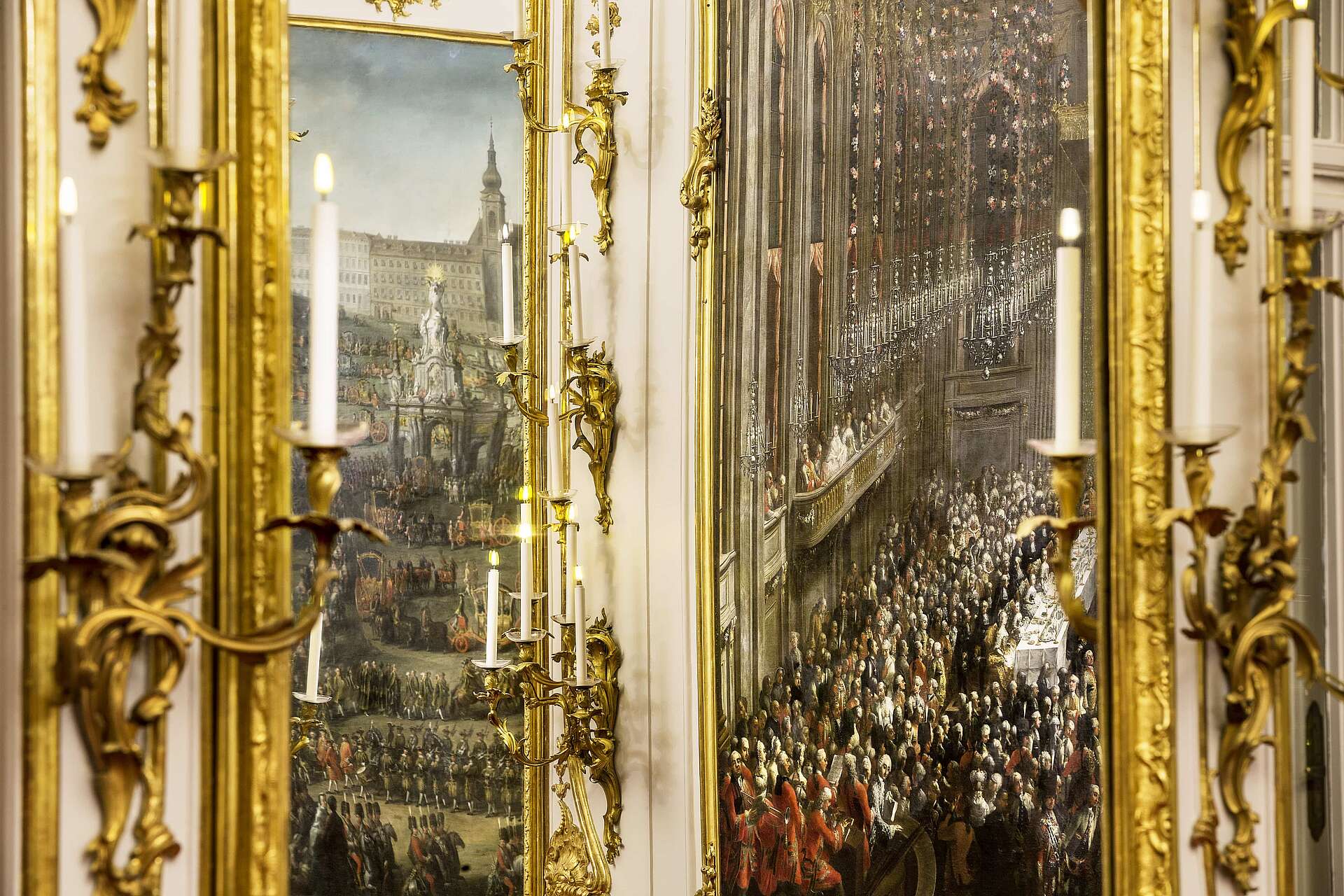 Auf der gegenüberliegenden Seite sehen Sie die kirchliche Vermählung in der Hofpfarrkirche zu Sankt Augustin sowie, rechts vom Porträt Maria Theresias, eine Opernserenade. In diesem Gemälde können Sie noch ein besonderes Detail entdecken. Unter den Zuschauern ist der kleine Mozart zu erkennen. Dieser war allerdings damals gar nicht anwesend, da er im Jahre der Hochzeit – 1760 – erst vier Jahre alt war und noch völlig unbekannt in Salzburg lebte. Die Fertigstellung der Gemäldeserie dauerte einige Jahre, und Mozart avancierte in der Zwischenzeit zu einem europaweit gefeierten Musiker, weshalb er nachträglich in diesem Gemälde verewigt wurde.