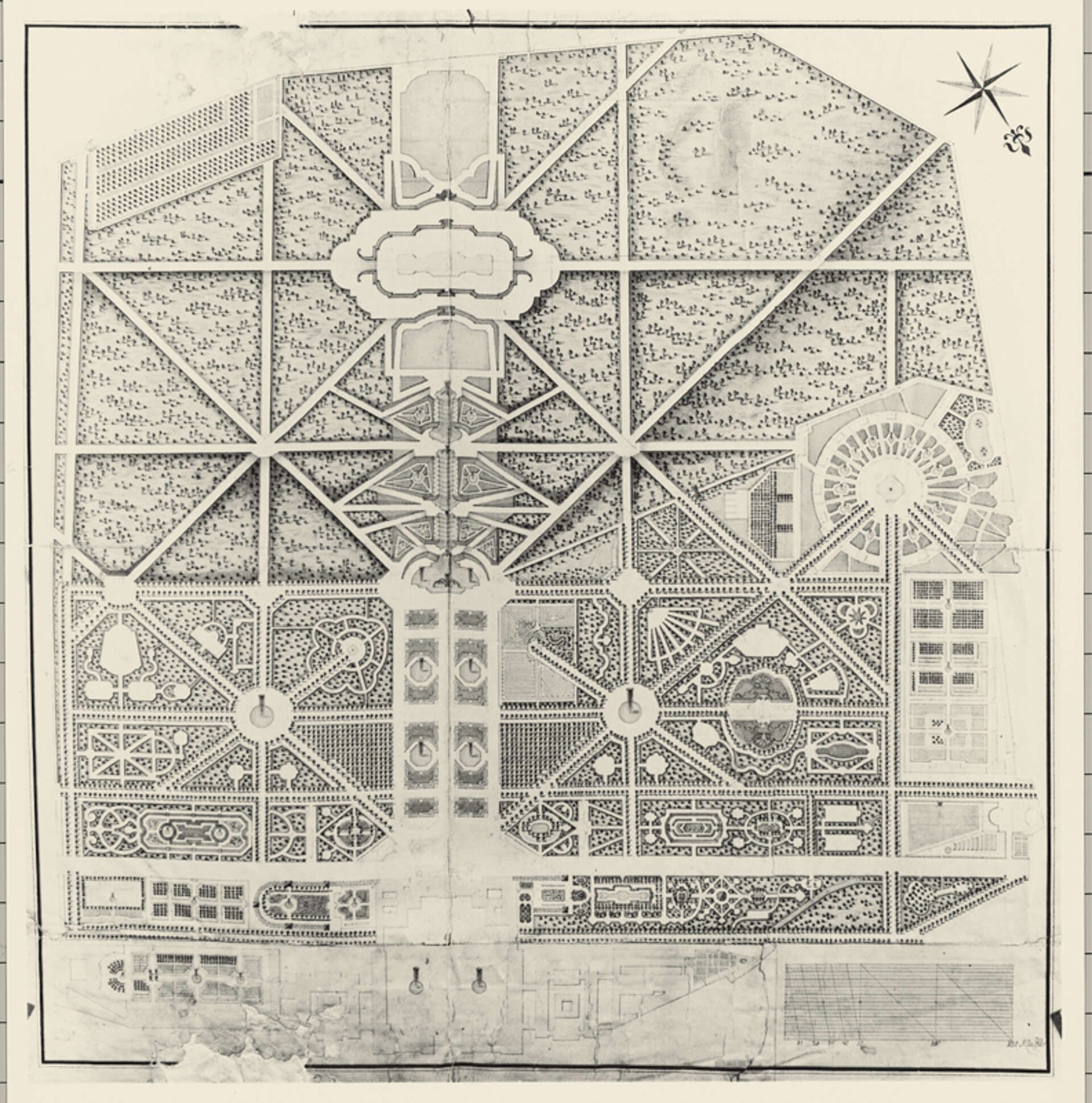 Vor der südseitigen Gartenfassade des Schlosses, dokumentiert durch das Gemälde von Bernardo Belotte, genannt Canaletto, datiert um 1760, beanspruchte das Parterre mit seinen streng symmetrisch angelegten Beeten die größte Ausdehnung. Die Beete waren aus feinem Buchs auf bunten Steinen gestaltet und aufgrund dieser Stickereimustern ähnlichen Ornamenten als „Broderieparterres“ bezeichnet. Seitlich des Parterres schlossen die sogenannten Boskette an, die aus streng gestutzten Baum- und Heckenkulissen geformt und mit kleinen Plätzen versehen wurden. Im Jahre 1753 ließ der naturwissenschaftlich interessierte Kaiser Franz I. Stephan im westlichen Teil des Schlossgartens Richtung Hietzing den Holländisch-Botanischen Garten anlegen, ein Jahr zuvor erfolgte die Gründung der Schönbrunner Menagerie. Während Schloss und Garten um 1760 weitgehend fertig gestellt waren, zeigte sich der Schönbrunner Berg in der Verlängerung des Großen Parterres nach wie vor als ungestaltete Waldschneise. Nach aufwendigen Planungen des Hofarchitekten Johann Ferdinand Hetzendorf von Hohenberg entschied sich die seit 1765 verwitwete Maria Theresia schweren Herzens, eine vereinfachte Lösung der neuen Gartengestaltung zu realisieren: Am Fuße des Schönbrunner Berges sollte der Neptunbrunnen entstehen und auf der Bergkuppe die Gloriette erbaut werden. Der Hügel selbst sollte anstelle von aufwendigen Terrassen lediglich mit Zickzack-Wegen erschließbar sein.