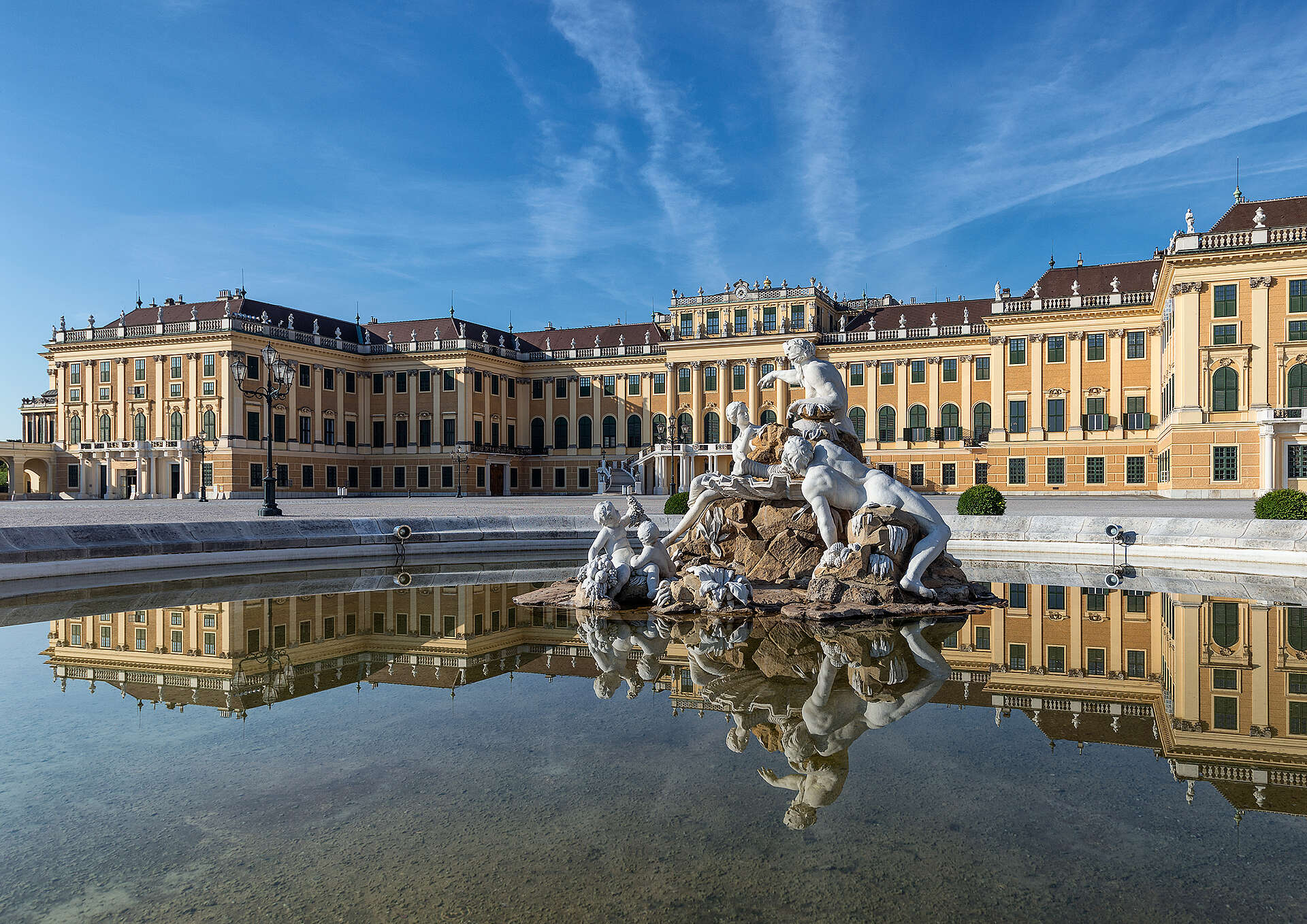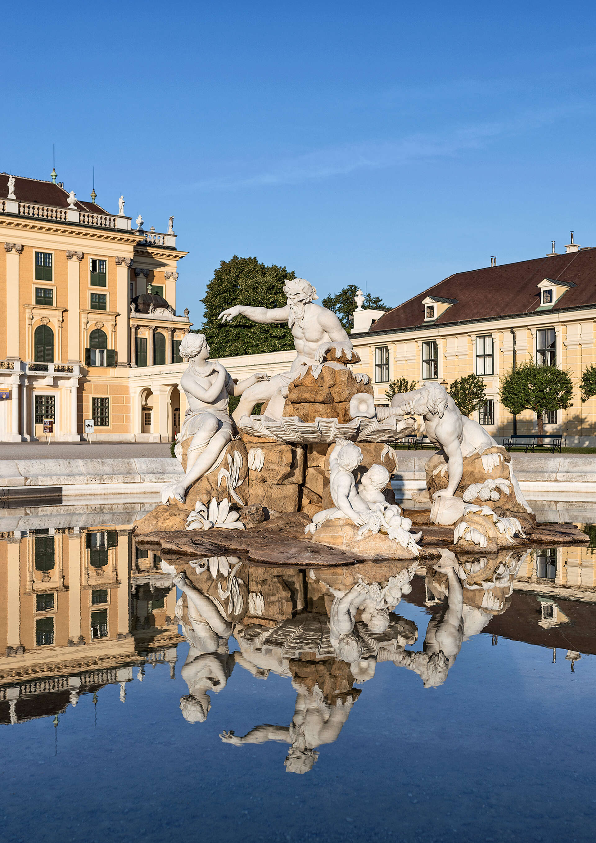 Bewundern Sie die Brunnenanlage im Schlosspark Schönbrunn, die sich im Ehrenhof beim Haupteingang des Schloß Schönbrunns befindet.
