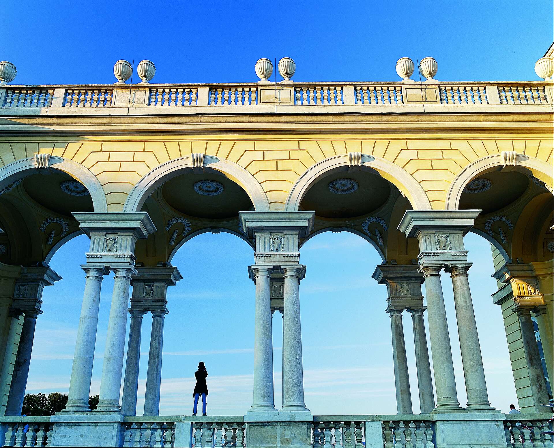 Neben der Freitreppe zum verglasten Mittelteil, in dem sich heute das Café Gloriette befindet, gibt es auch seitliche Treppenanlagen, die von mächtigen Trophäenstücken gesäumt sind.