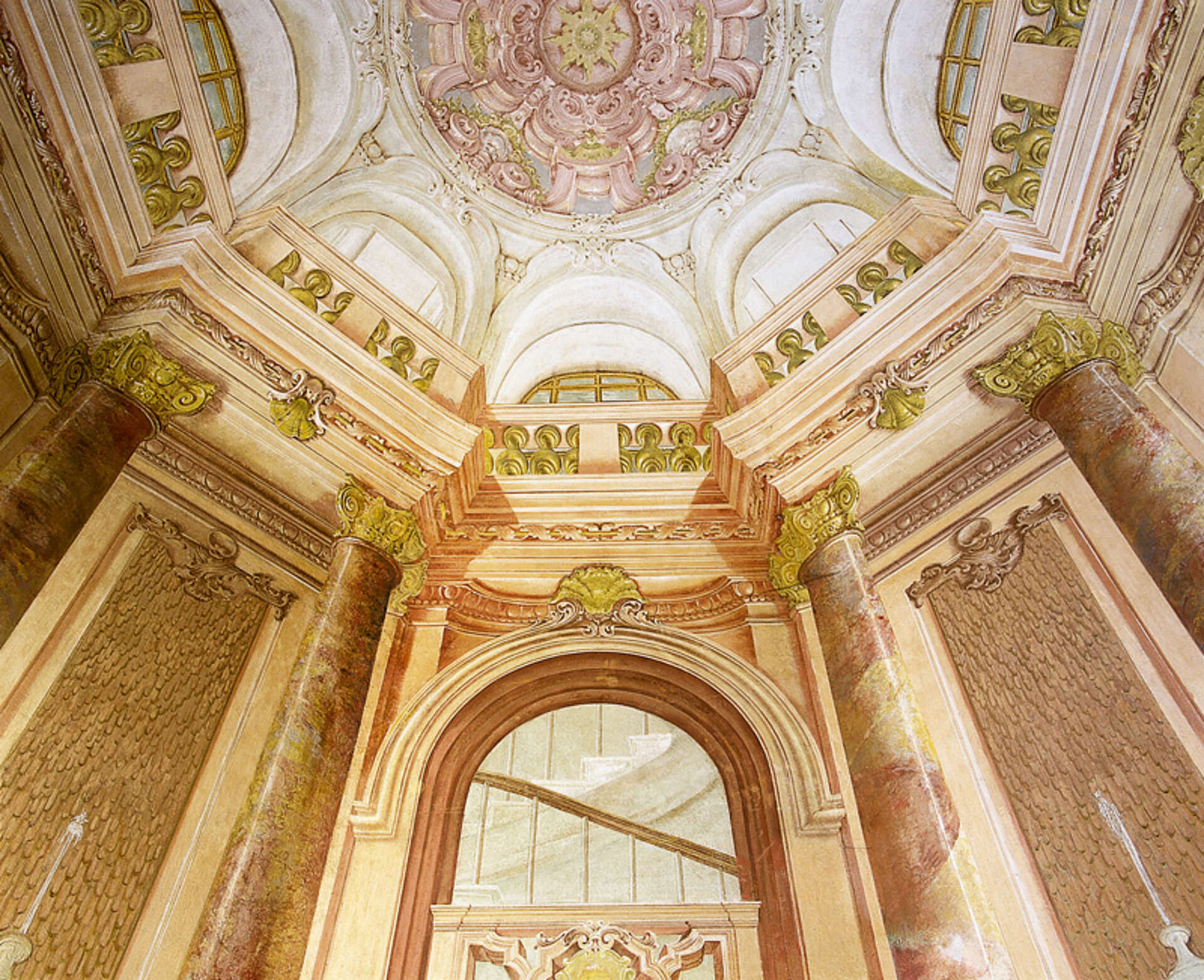 Der Innenraum ist im Erdgeschoß mit einer Architekturmalerei im Stil des Rokokos ausgestattet. Im Obergeschoß, in das man über ein angebautes Treppenhaus gelangt, bietet ein luftiger, mit Balkonen versehener Raum Aussichten in die Baumpartien des Parks.
