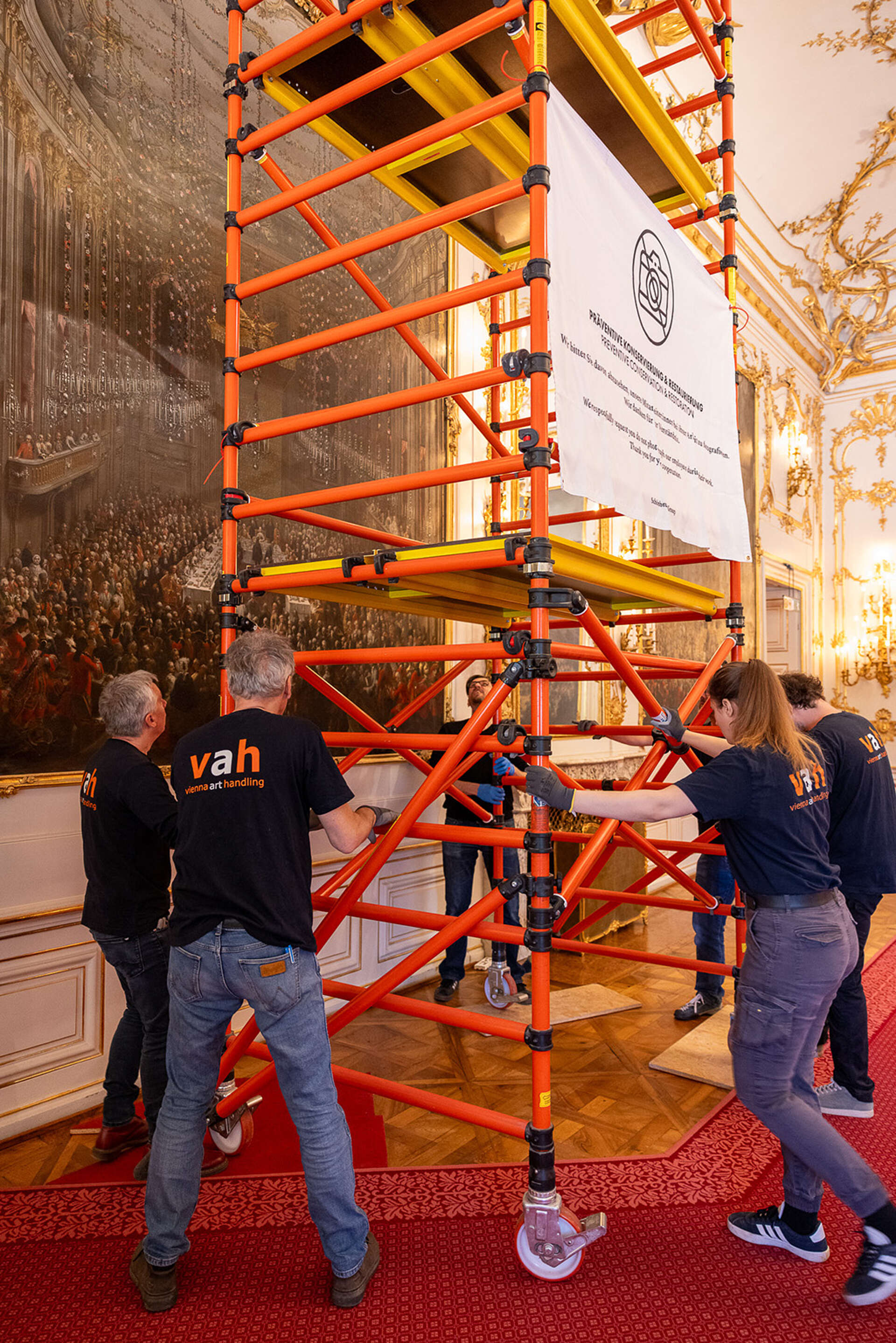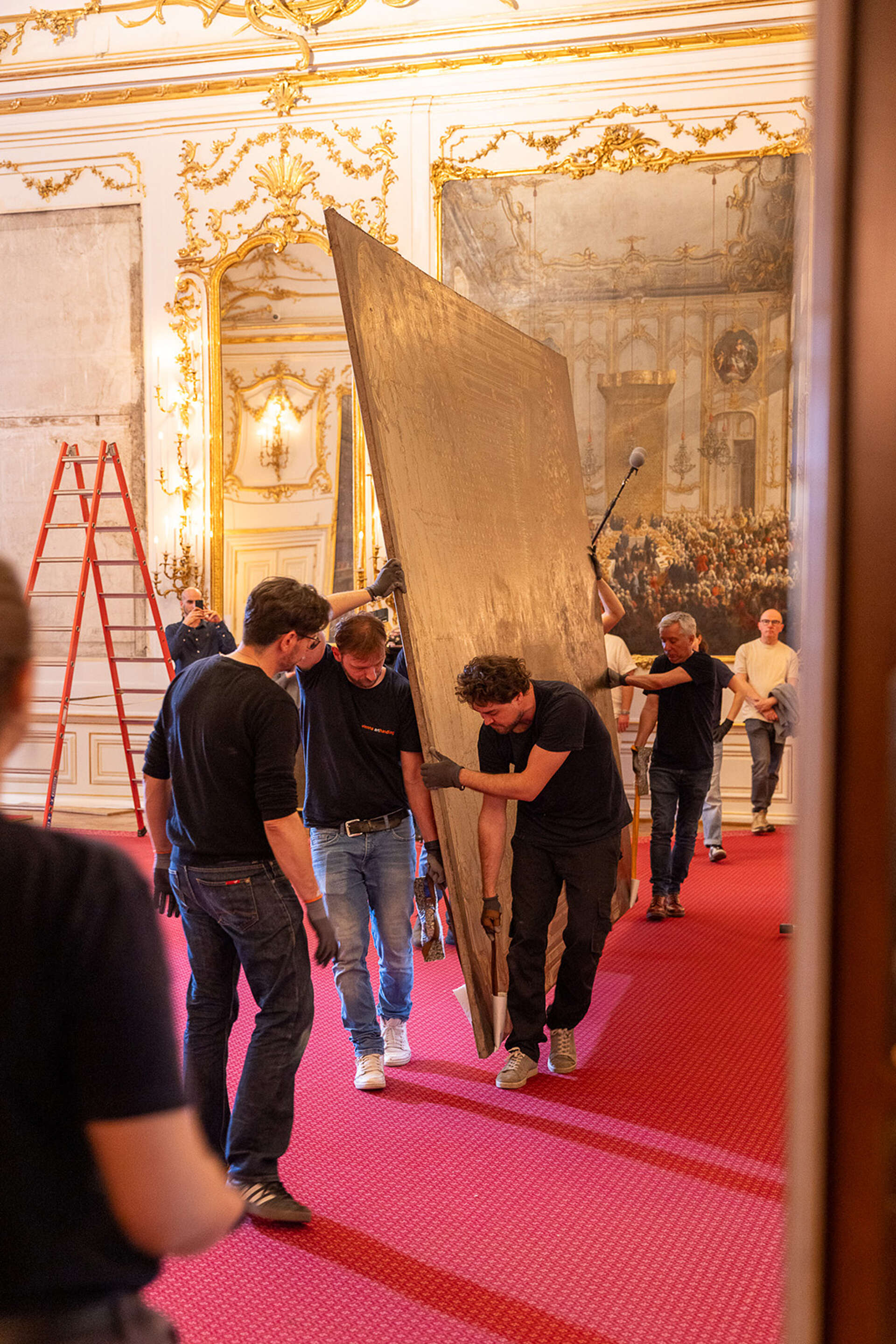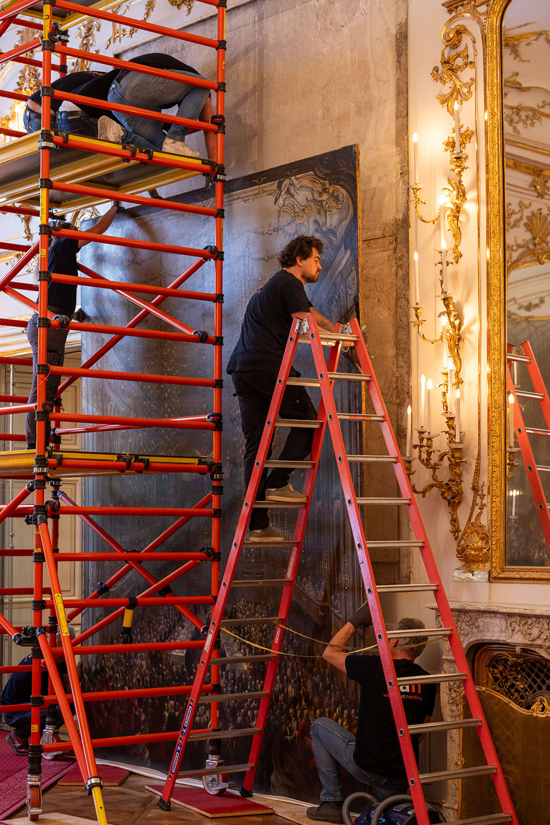 Um die Restaurierung der Wandvertäfelungen und der Decke unter bestmöglichen Bedingungen durchführen zu können, wird der Zeremoniensaal in den kommenden Wochen in eine „Raum-in-Raum“-Konstruktion eingebettet. Diese architektonische Lösung in Form eines Gerüstes mit Plattform ermöglicht es den Besucher:innen, den Raum weiterhin zu durchqueren – trotz der laufenden konservatorischen Arbeiten und ohne Einschränkung ihres Rundgangs.