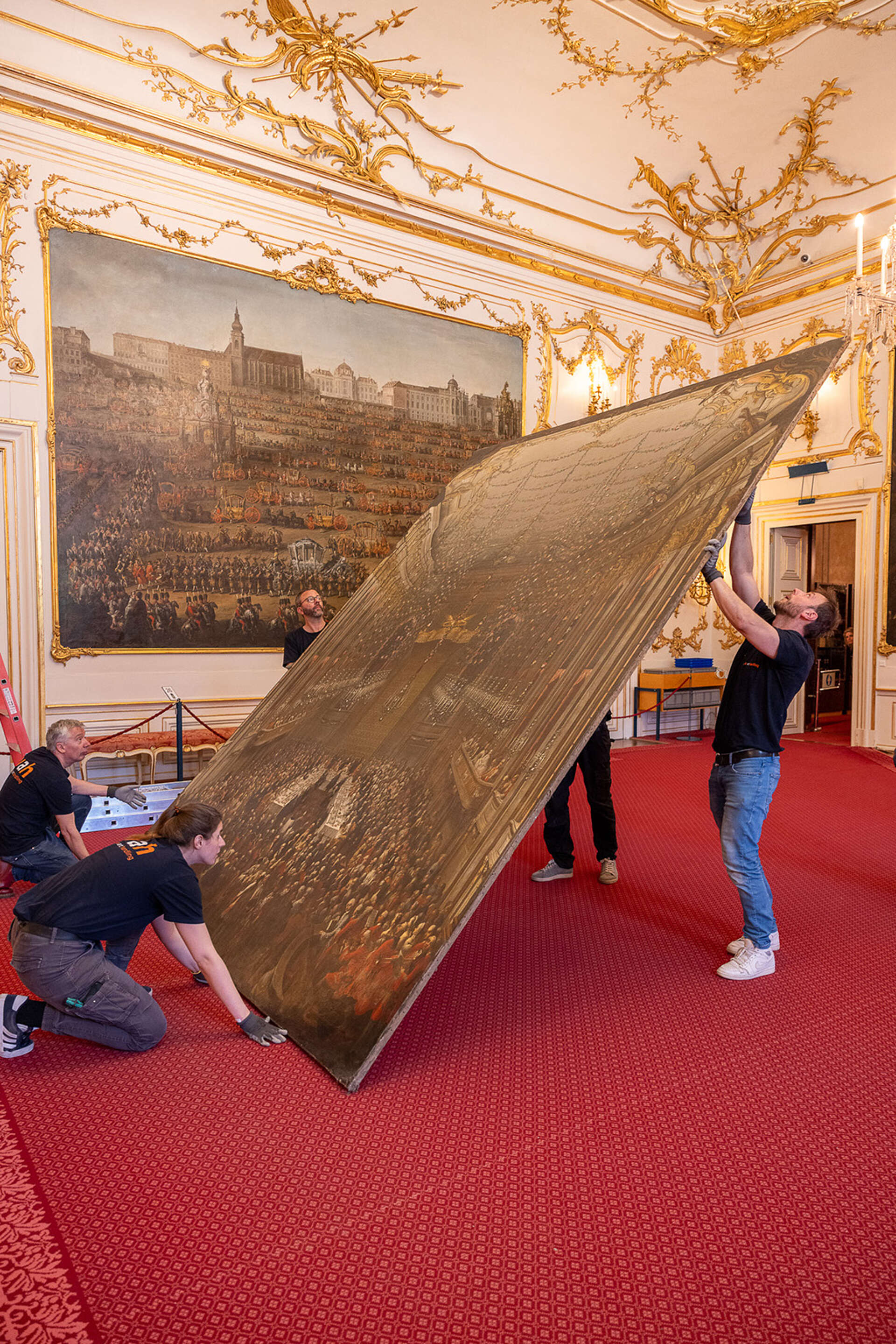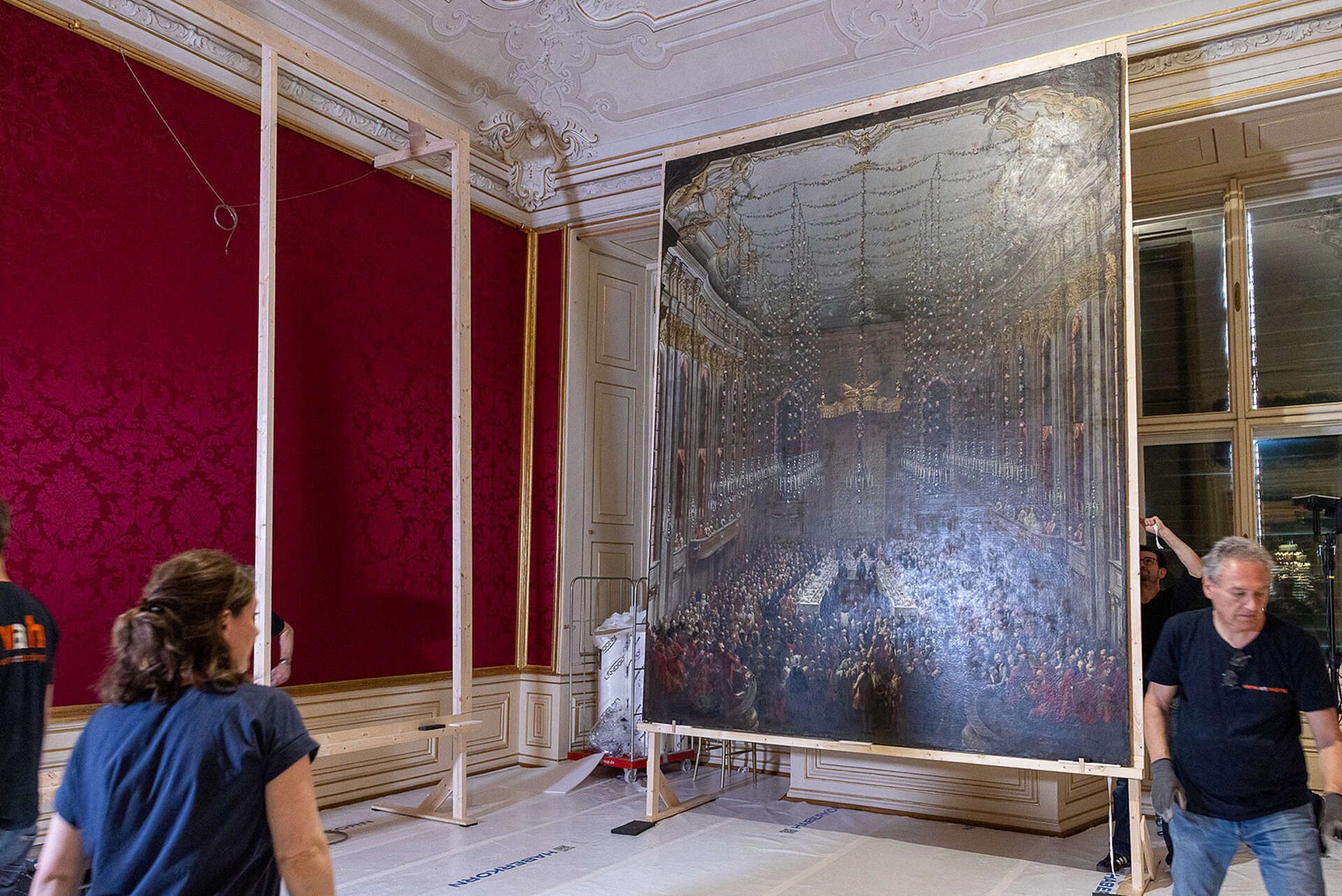 Der Zeremoniensaal ist einer der prachtvollsten Räume von Schloss Schönbrunn – reich ausgestattet, historisch bedeutend und zur Zeit Maria Theresias ein zentraler Ort für offizielle Anlässe am kaiserlichen Hof. Herzstück des Raumes ist die Gemäldeserie zur Hochzeit von Erzherzog Joseph (Joseph II) mit Prinzessin Isabella von Bourbon-Parma. Seit Mai 2025 wird der prachtvolle Saal restauriert. Die großformatigen Gemälde wurden fachgerecht abgenommen und verbleiben während ihrer Restaurierung in einem eigens eingerichteten Atelier im Schloss – ein Vorgehen, das aufgrund ihrer außergewöhnlichen Größe notwendig ist.